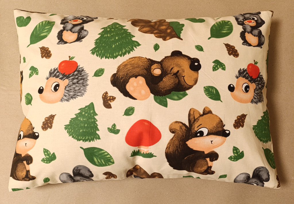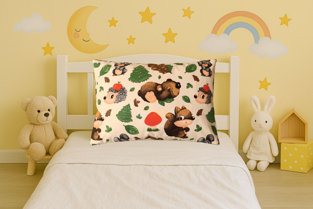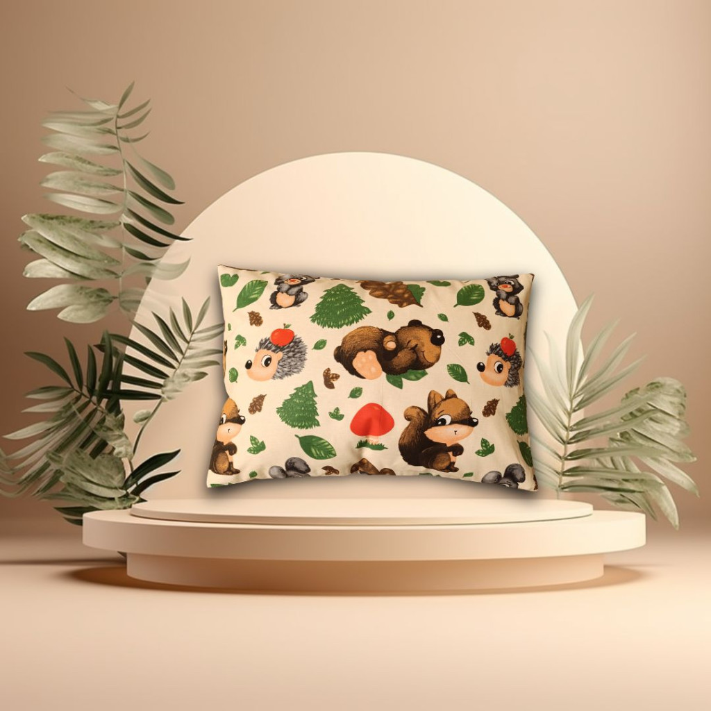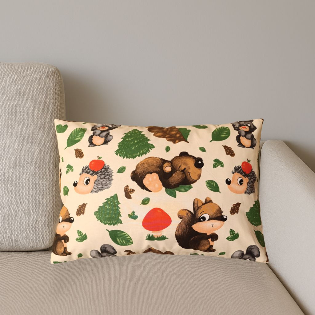 A mókus és barátai mintázatú párna különösen kedvelt a gyermekek körében, hiszen vidám erdei állatokkal díszített, természetközeli hangulatot teremtve.