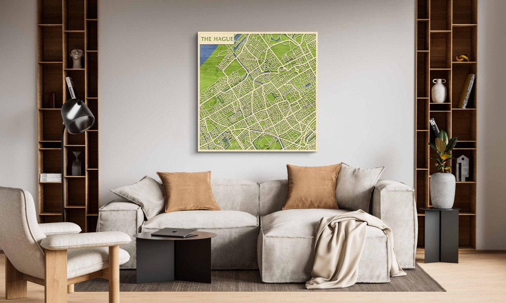 A rétegzett, lézervágott fa dekor Hága jellegzetes városszövetét és fő útvonalait jeleníti meg precíz rajzolattal. A fa természetes textúrája barátságos, kifinomult jelenlétet ad, miközben a grafikus kontúrok fókuszt és rendezettséget biztosítanak. A telepítés kényelmes: fúrás nélkül, kétoldalas ragasztószalaggal ajánlott, sima, por- és zsírmentes, száraz falfelületre. A termék két méretben készül (48 × 48 cm; 70 × 70 cm), továbbá három színben – Zöld (természetközeli), Fekete (letisztult kontraszt), Ében (elegáns mélység) – elérhető, így a tér arányaihoz és hangulatához is igazítható. Visszafogott eleganciája miatt ajándéknak is jó választás.