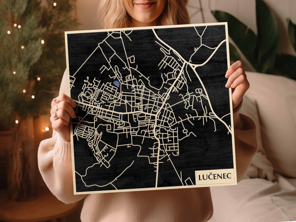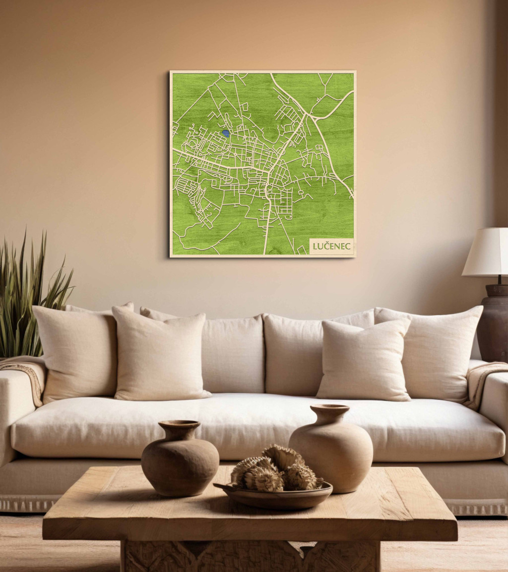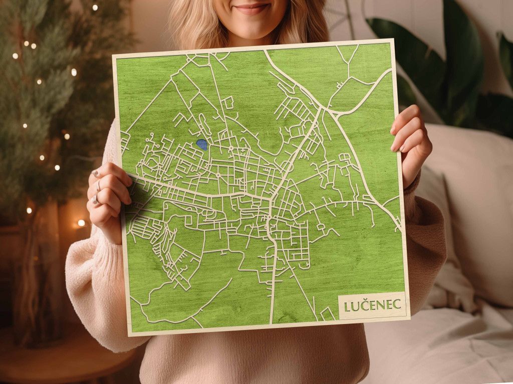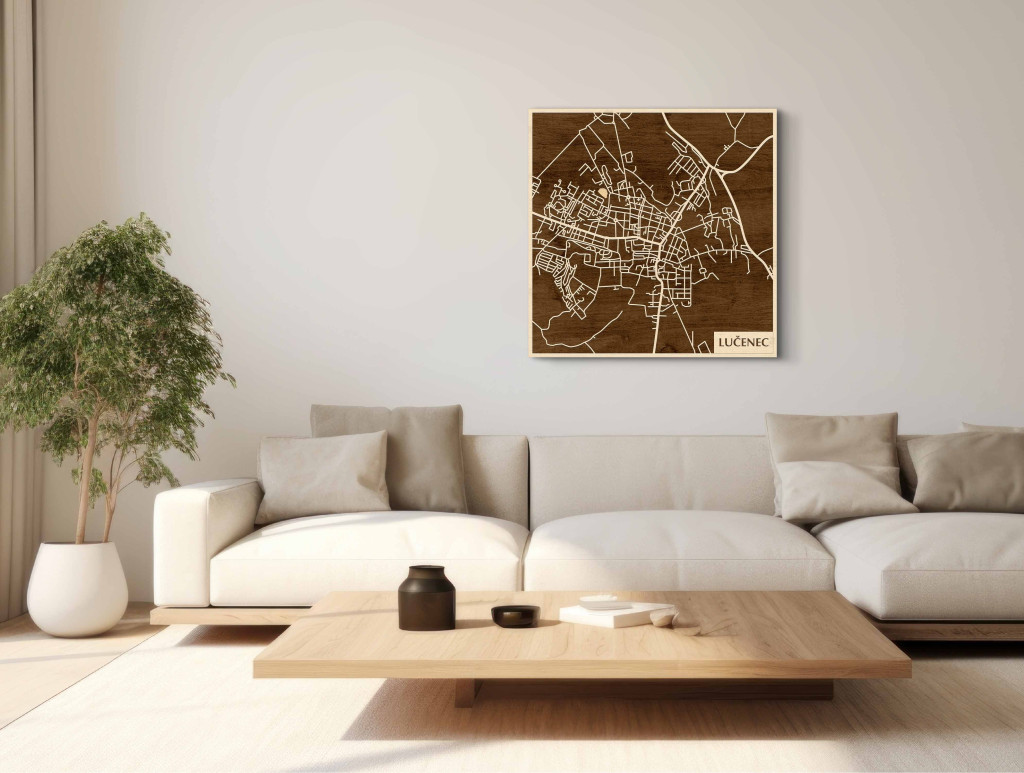 A rétegzett, lézervágott fa dekor Losonc – Lučenec jellegzetes városszövetét és főbb útvonalait mutatja be tiszta, fókuszált kontúrokkal. A fa természetes textúrája barátságos, nyugodt jelenlétet ad, miközben a grafikus rajzolat rendezett, modern látványt biztosít. A telepítés kényelmes: fúrás nélkül, kétoldalas ragasztószalaggal javasolt, sima, por- és zsírmentes, száraz falfelületre. A termék két méretben (48 × 48 cm; 70 × 70 cm) és három színben – Zöld (természetközeli), Fekete (letisztult kontraszt), Ében (elegáns mélység) – érhető el, így a tér arányaihoz és hangulatához igazítható. Ajándékként is univerzális, visszafogott és időtálló megjelenéssel.