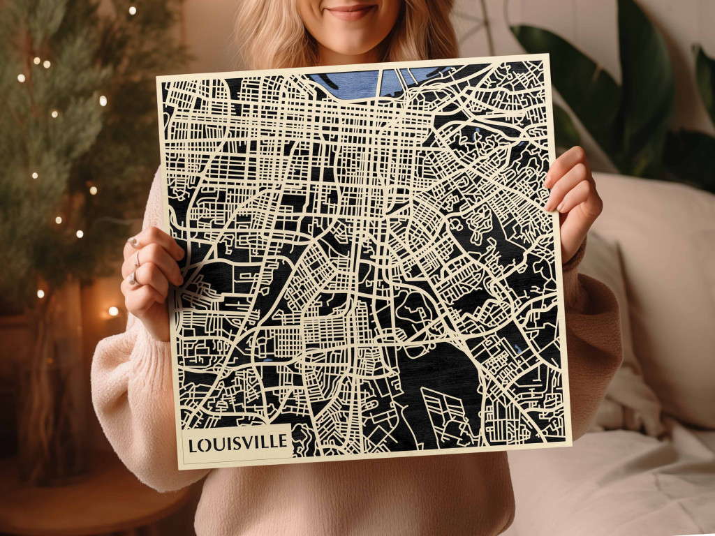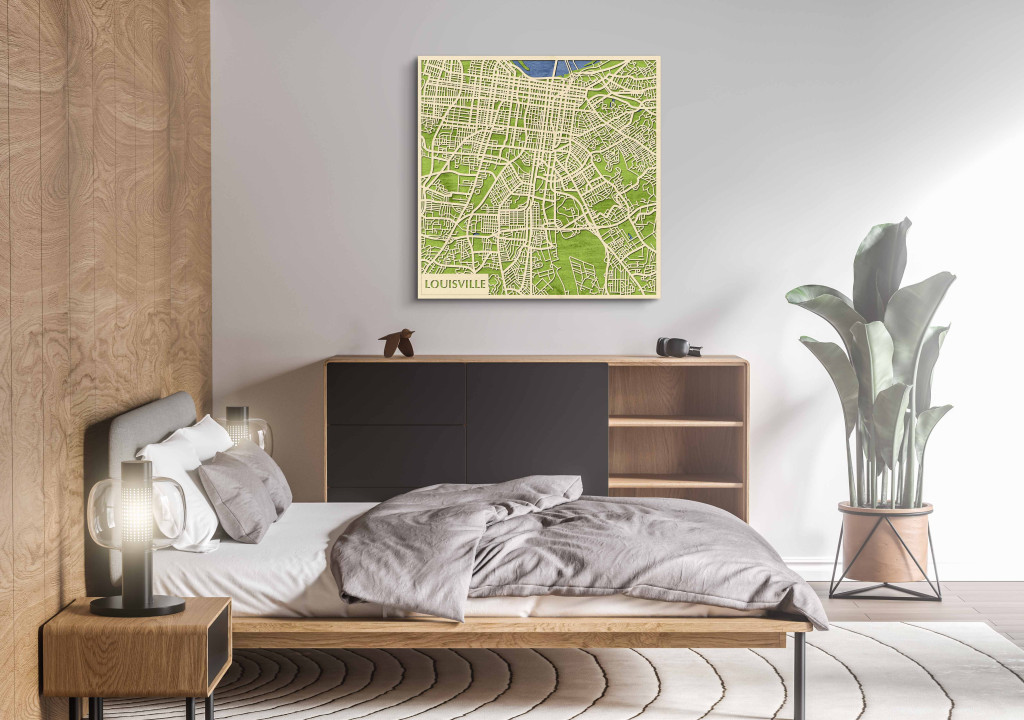 A rétegzett, lézervágott fa dekor Louisville városszerkezetét és főbb útvonalait emeli ki tiszta, fókuszált rajzolattal. A fa természetes textúrája barátságos, kiegyensúlyozott jelenlétet ad, miközben a grafikus kontúrok rendezett, modern fókuszpontot teremtenek. A telepítés egyszerű és tiszta: fúrás nélkül, kétoldalas ragasztószalaggal javasolt rögzíteni sima, por- és zsírmentes, száraz falra. A termék két méretben elérhető (48 × 48 cm; 70 × 70 cm), és három színben – Zöld (természetközeli), Fekete (letisztult kontraszt), Ében (elegáns mélység) – választható, így a tér arányaihoz és stílusához igazítható. Ajándéknak is kiváló, mivel visszafogott és időtálló.