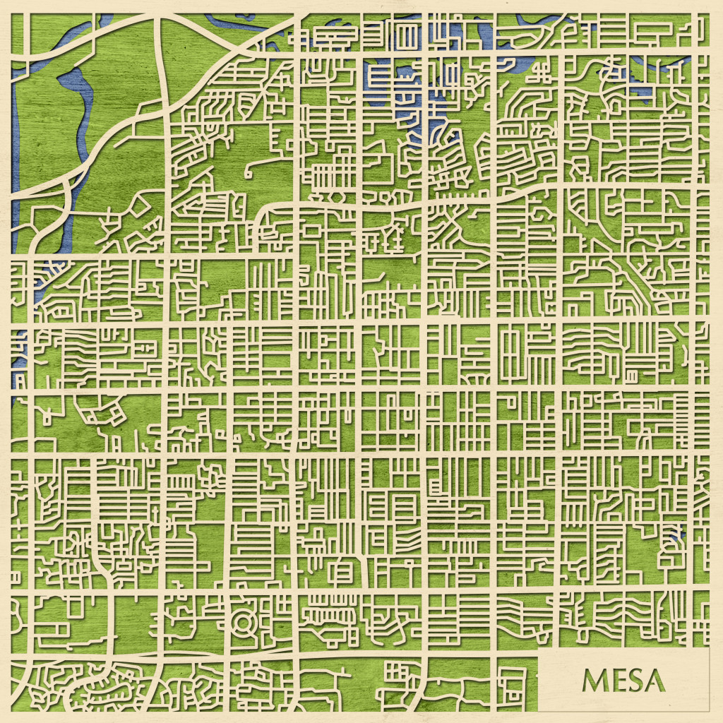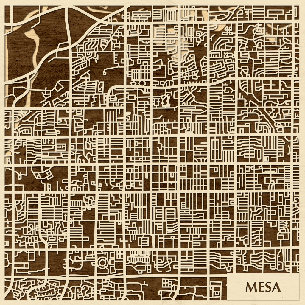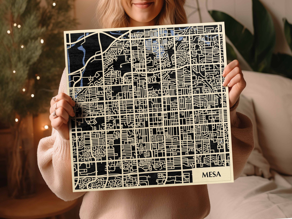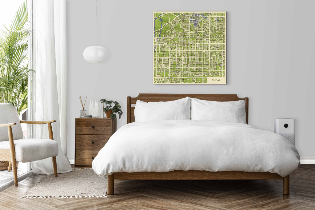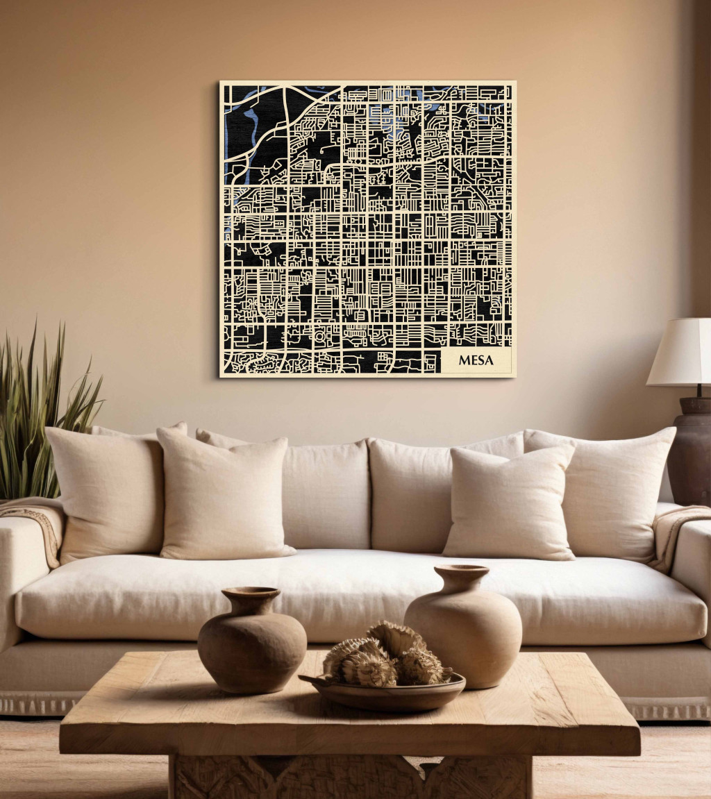 A rétegzett, lézervágott fa dekor Mesa városszövetét és főbb útvonalait emeli ki tiszta, fókuszált rajzolattal. A fa természetes textúrája barátságos, nyugodt jelenlétet ad, miközben a grafikus kontúrok rendezett, modern hatást keltenek. A telepítés kényelmes: fúrás nélkül, kétoldalas ragasztószalaggal javasolt felhelyezni sima, por- és zsírmentes, száraz falfelületre. A termék két méretben (48 × 48 cm; 70 × 70 cm) és három színben – Zöld (természetközeli), Fekete (letisztult kontraszt), Ében (elegáns mélység) – elérhető, így a belső tér arányaihoz és stílusához igazítható. Ajándékként is kiváló, visszafogott, időtálló megjelenéssel.