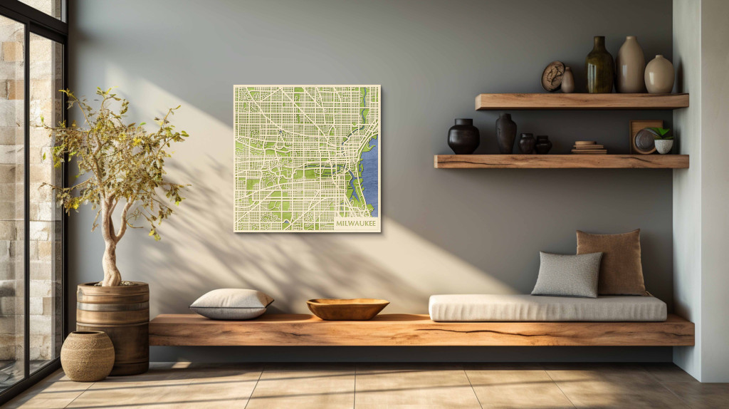 A rétegzett, lézervágott fa dekor Milwaukee városszövetét, főbb útvonalait és a vízpart által formált csomópontokat emeli ki tiszta, fókuszált rajzolattal. A fa természetes textúrája barátságos, kiegyensúlyozott jelenlétet biztosít, miközben a grafikus kontúrok rendezett, modern hatást keltenek. Telepítése gyors és tiszta: fúrás nélkül, kétoldalas ragasztószalaggal javasolt felhelyezni sima, por- és zsírmentes, száraz falra. A termék két méretben (48 × 48 cm; 70 × 70 cm) és három színben – Zöld (természetközeli), Fekete (letisztult kontraszt), Ében (elegáns mélység) – kapható, így a tér arányaihoz és stílusához illeszthető. Ajándékként is univerzális, visszafogott és időtálló megjelenéssel.