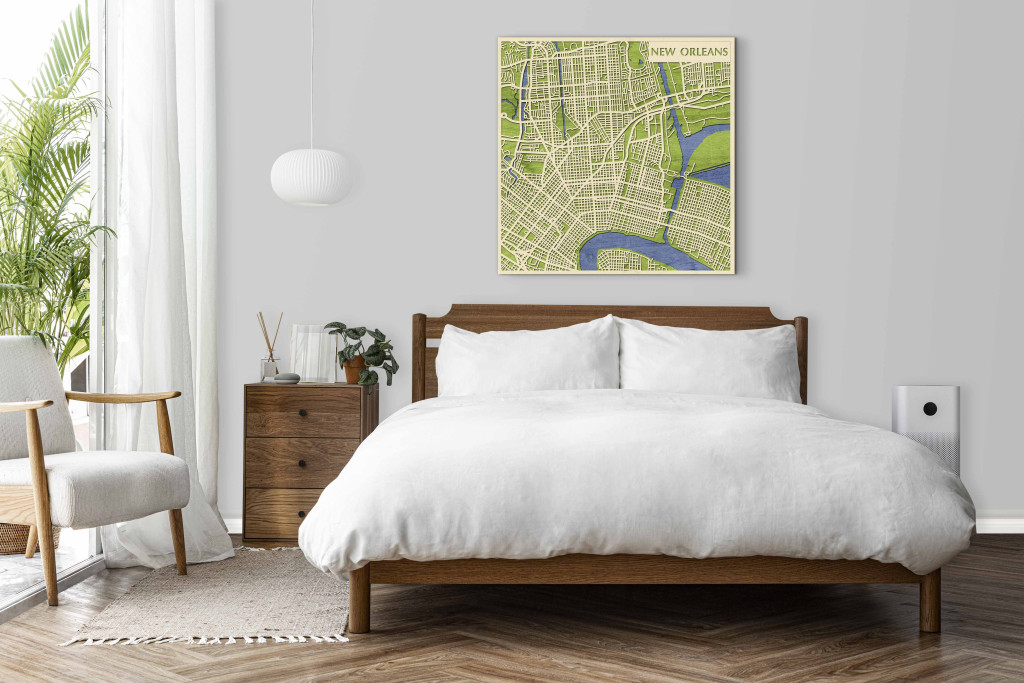 A rétegzett, lézervágott fa dekor New Orleans városszövetét, a folyó kanyarulatához igazodó szerkezetet és a történelmi központ csomópontjait emeli ki tiszta, fókuszált kontúrokkal. A fa természetes textúrája barátságos, nyugodt jelenlétet ad, miközben a grafikus rajzolat rendezett, modern fókuszpontot teremt. A telepítés kényelmes és tiszta: fúrás nélkül, kétoldalas ragasztószalaggal javasolt rögzíteni sima, por- és zsírmentes, száraz falfelületre. A termék két méretben (48 × 48 cm; 70 × 70 cm) és három színben – Zöld (természetközeli), Fekete (letisztult kontraszt), Ében (elegáns mélység) – kapható, így a belső tér arányaihoz és stílusához igazítható. Ajándékként is univerzális, visszafogott és időtálló megjelenéssel.