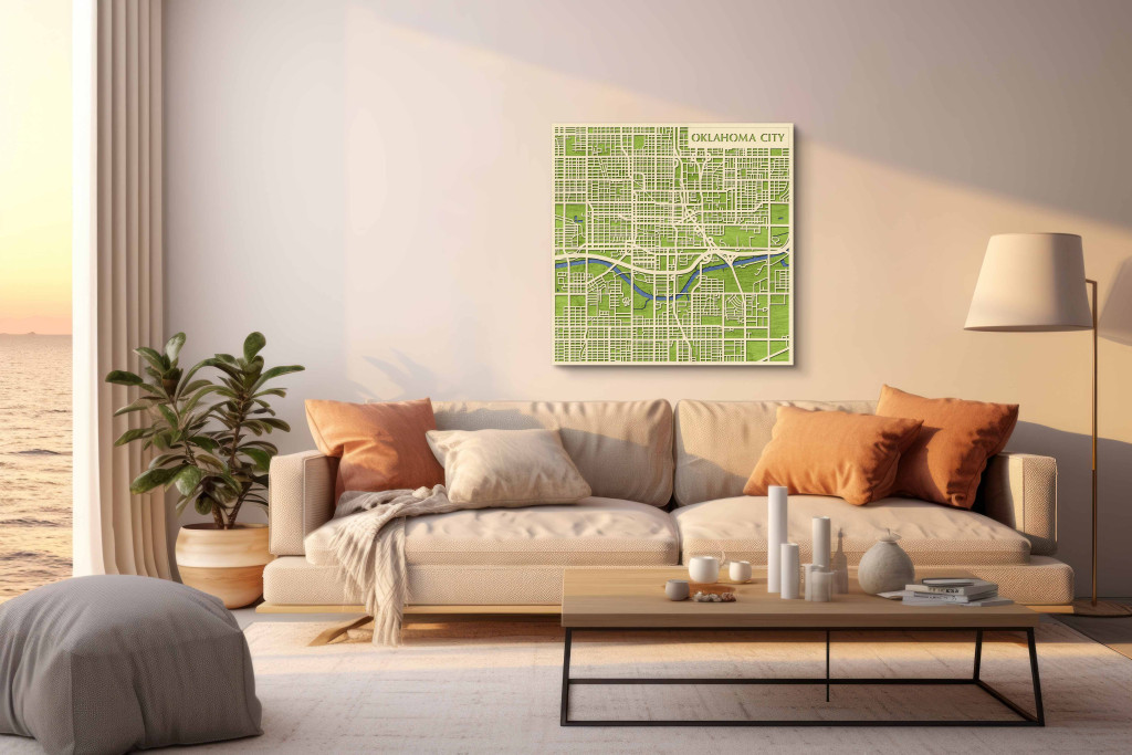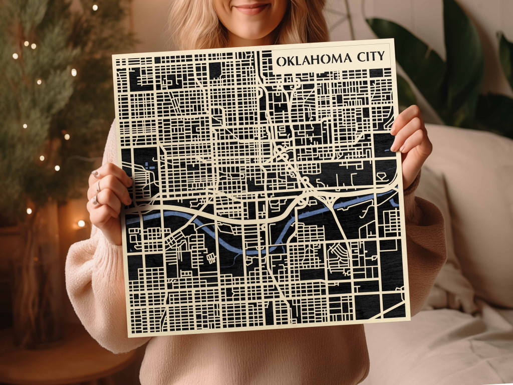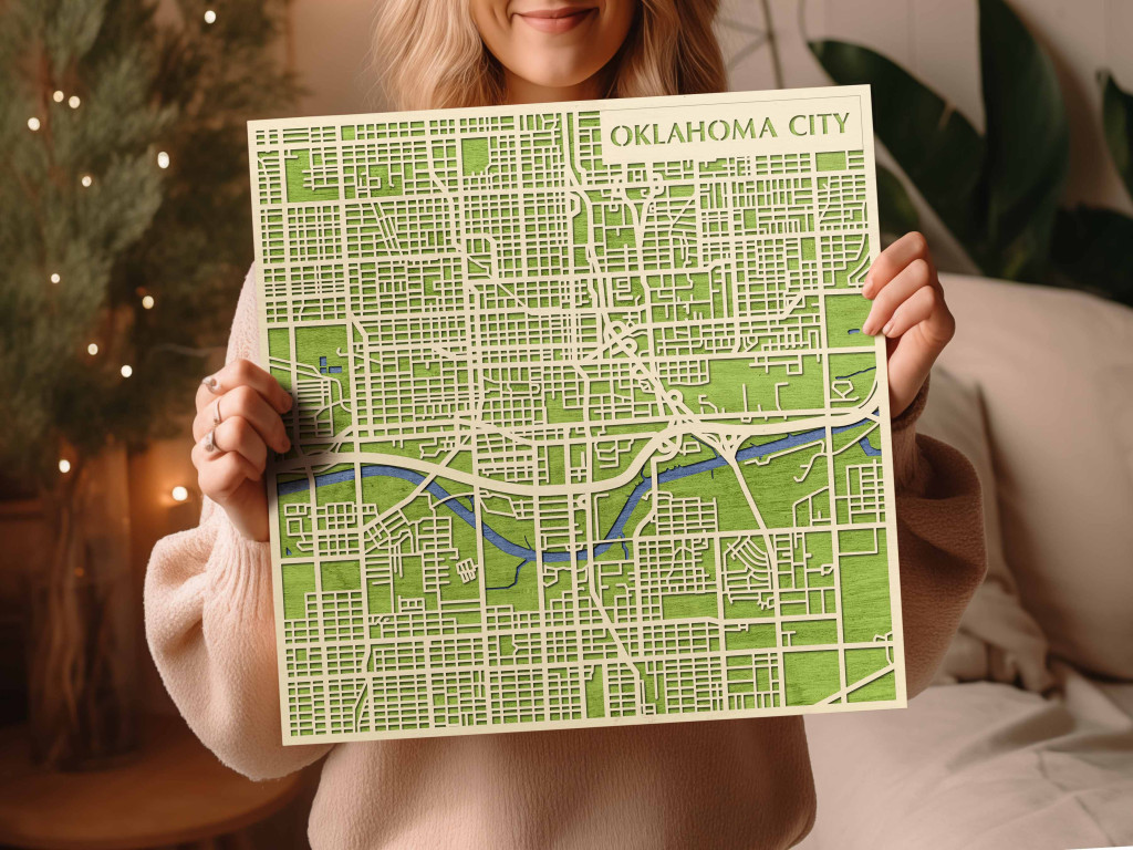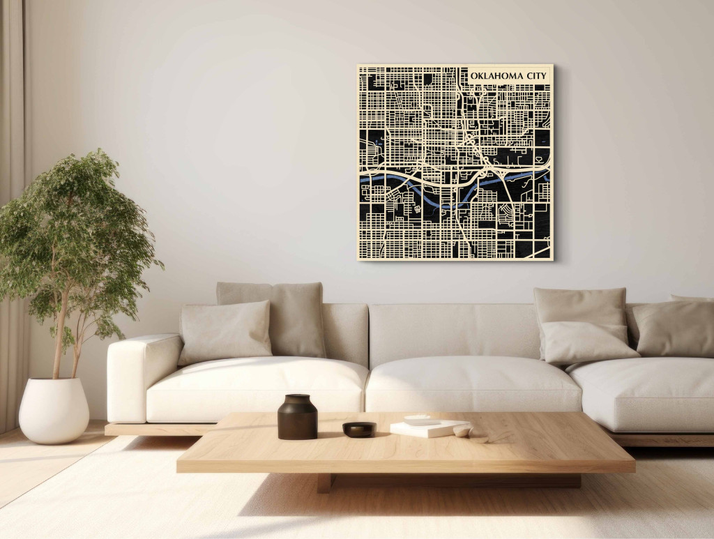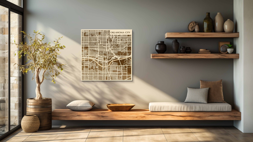 A rétegzett, lézervágott fa dekor Oklahoma City városszövetét, a főbb sugárutak hálózatát és a belváros szerkezetét emeli ki tiszta, fókuszált kontúrokkal. A fa természetes textúrája barátságos, nyugodt jelenlétet biztosít, miközben a grafikus rajzolat rendezett, modern fókuszpontot teremt. Telepítése gyors és tiszta: fúrás nélkül, kétoldalas ragasztószalaggal javasolt rögzíteni sima, por- és zsírmentes, száraz falfelületre. A termék két méretben (48 × 48 cm; 70 × 70 cm) és három színben – Zöld (természetközeli), Fekete (letisztult kontraszt), Ében (elegáns mélység) – kapható, így könnyen illeszthető a belső tér arányaihoz és stílusához. Ajándéknak is univerzális, visszafogott és időtálló megjelenéssel.