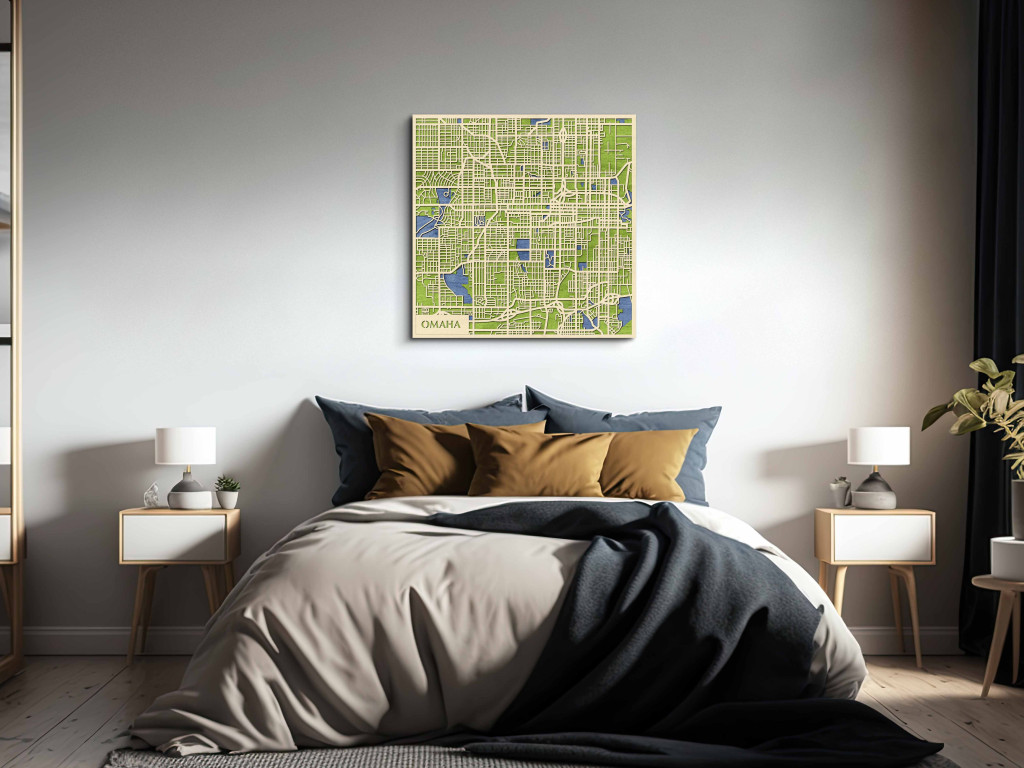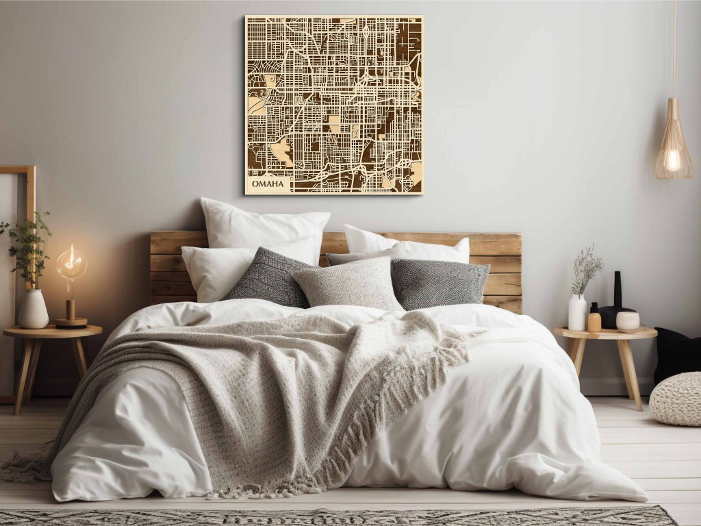 A rétegzett, lézervágott fa dekor Omaha városszövetét, a folyóparti hidak csomópontjait és a főbb útvonalak hálózatát emeli ki tiszta, fókuszált kontúrokkal. A fa természetes textúrája barátságos, nyugodt jelenlétet ad, miközben a grafikus rajzolat rendezett, modern fókuszpontot teremt. Telepítése gyors és tiszta: fúrás nélkül, kétoldalas ragasztószalaggal javasolt rögzíteni sima, por- és zsírmentes, száraz falfelületre. A termék két méretben (48 × 48 cm; 70 × 70 cm) és három színben – Zöld (természetközeli), Fekete (letisztult kontraszt), Ében (elegáns mélység) – kapható, így könnyen illeszthető a belső térhez. Ajándéknak is univerzális, visszafogott és időtálló megjelenéssel.