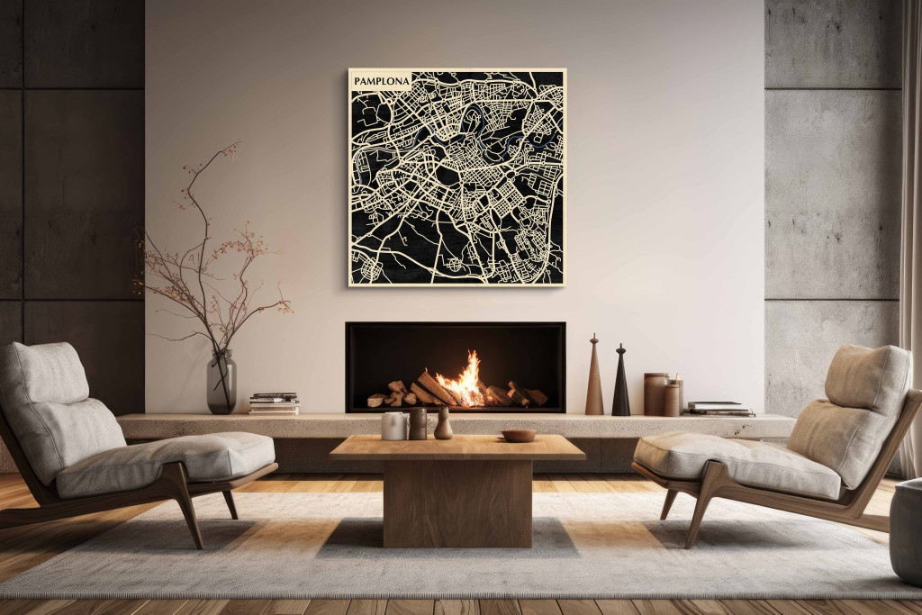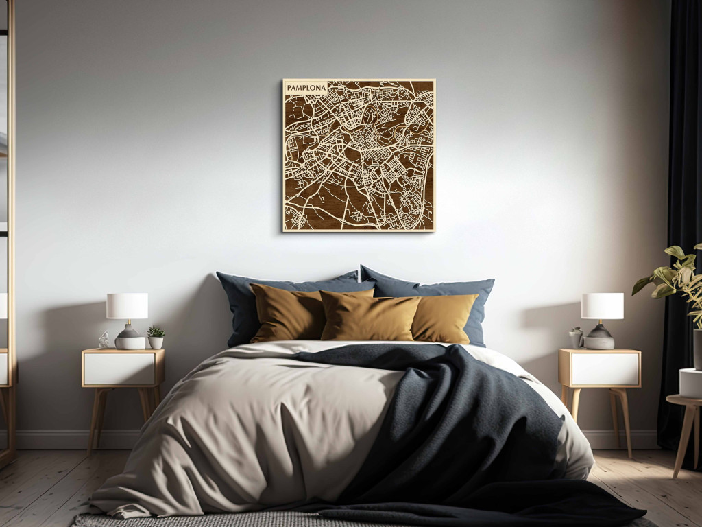 A rétegzett, lézervágott fa dekor Pamplona városszövetét, a központi terekhez kapcsolódó utcákat és a történelmi városfalak vonalát emeli ki tiszta, fókuszált kontúrokkal. A fa természetes textúrája nyugodt, barátságos jelenlétet ad, miközben a grafikus rajzolat rendezett, modern fókuszpontot teremt. A telepítés gyors és tiszta: fúrás nélkül, kétoldalas ragasztószalaggal javasolt rögzíteni sima, por- és zsírmentes, száraz falfelületre. A termék két méretben (48 × 48 cm; 70 × 70 cm) és három színben – Zöld (természetközeli), Fekete (letisztult), Ében (elegáns) – kapható. Ajándéknak is univerzális, visszafogott és időtálló.
