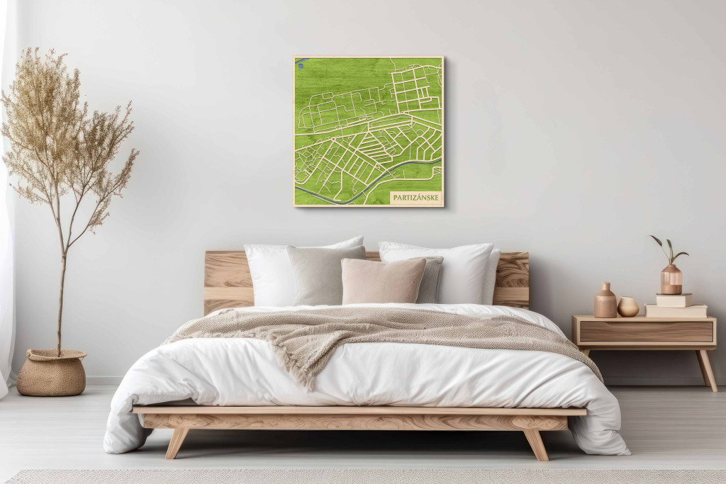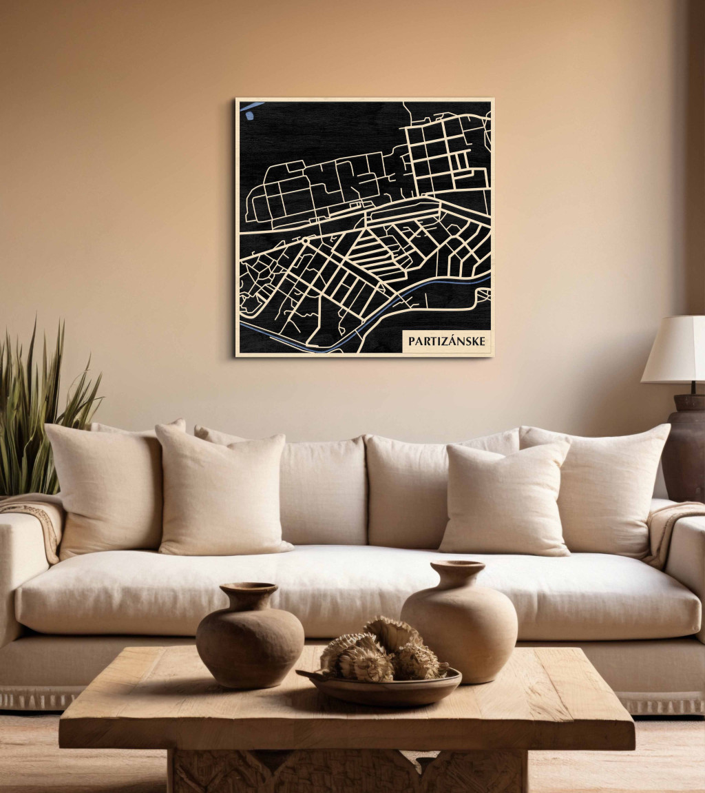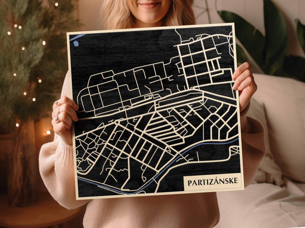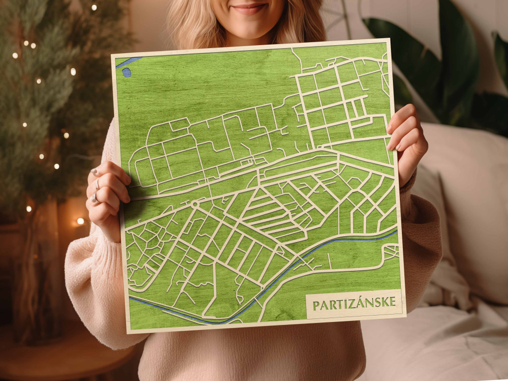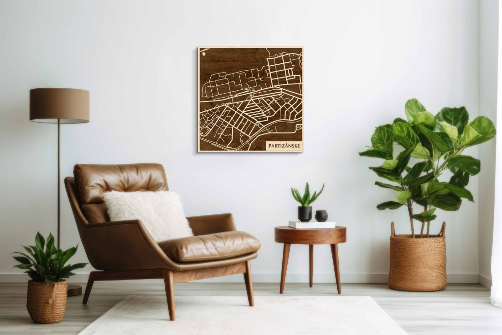 A rétegzett, lézervágott fa dekor Partizánske városszövetét, a főbb útvonalak rendszerét és a központi csomópontokat emeli ki tiszta, fókuszált kontúrokkal. A fa természetes textúrája nyugodt, barátságos jelenlétet ad, miközben a grafikus rajzolat rendezett, modern fókuszpontot hoz létre. Telepítése gyors és tiszta: fúrás nélkül, kétoldalas ragasztószalaggal javasolt rögzíteni sima, por- és zsírmentes, száraz falfelületre. Két méret (48 × 48 cm; 70 × 70 cm) és három szín – Zöld (természetközeli), Fekete (letisztult), Ében (elegáns) – közül választhat. Ajándékként is univerzális, visszafogott és időtálló megjelenéssel.