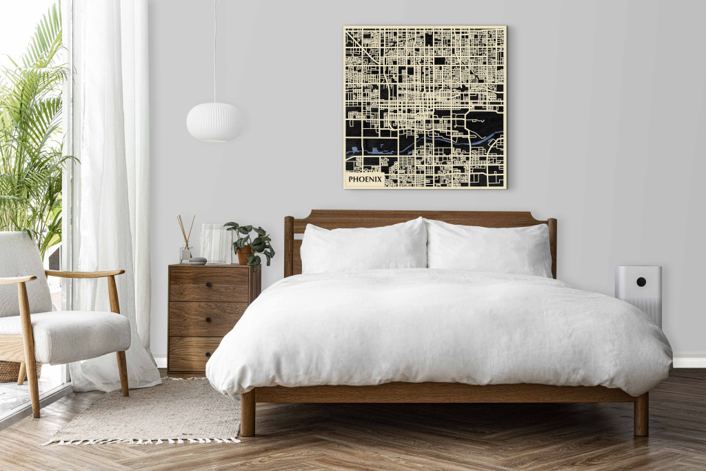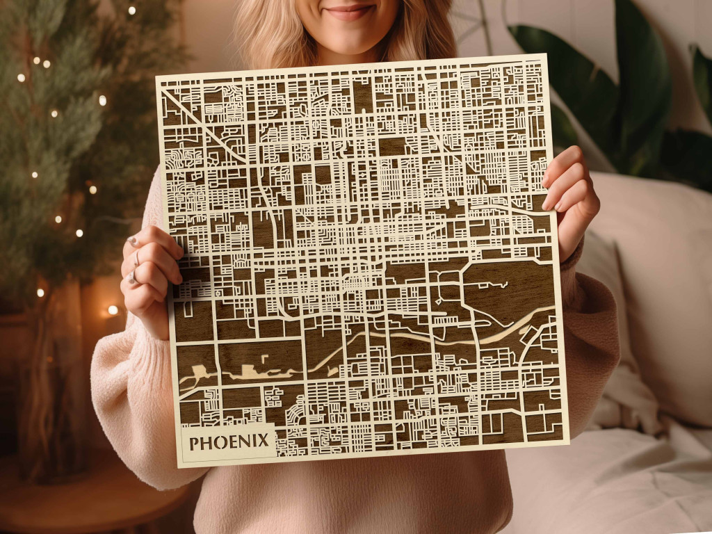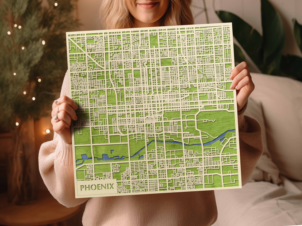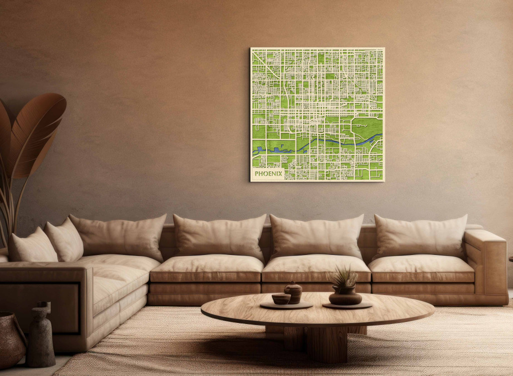 A rétegzett, lézervágott fa dekor Phoenix városszövetét, a belvárosi rácshálót és a sivatagi tengelyekhez igazodó főútvonalakat emeli ki tiszta, fókuszált kontúrokkal. A fa természetes textúrája nyugodt, barátságos jelenlétet ad, miközben a grafikus rajzolat rendezett, modern fókuszpontot hoz létre. Telepítése gyors és tiszta: fúrás nélkül, kétoldalas ragasztószalaggal javasolt rögzíteni sima, por- és zsírmentes, száraz falfelületre. A termék két méretben (48 × 48 cm; 70 × 70 cm) és három színben – Zöld (természetközeli), Fekete (letisztult kontraszt), Ében (elegáns mélység) – kapható. Ajándékként is univerzális, visszafogott és időtálló.