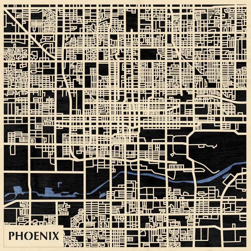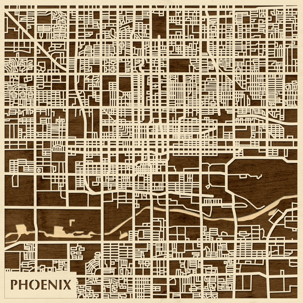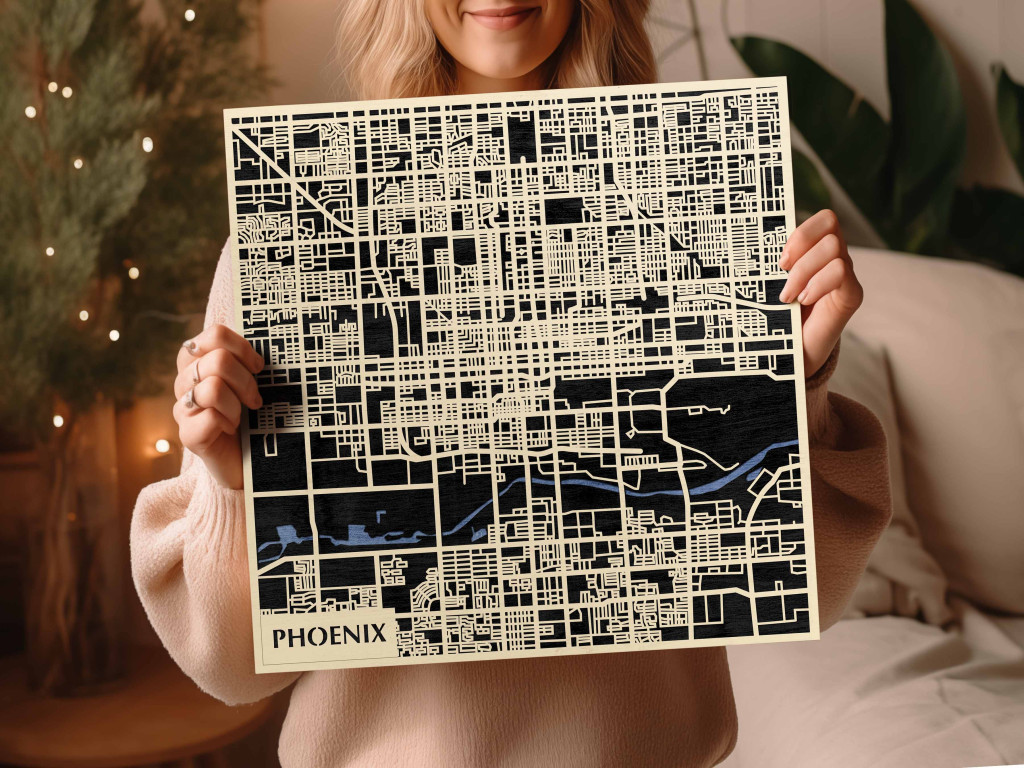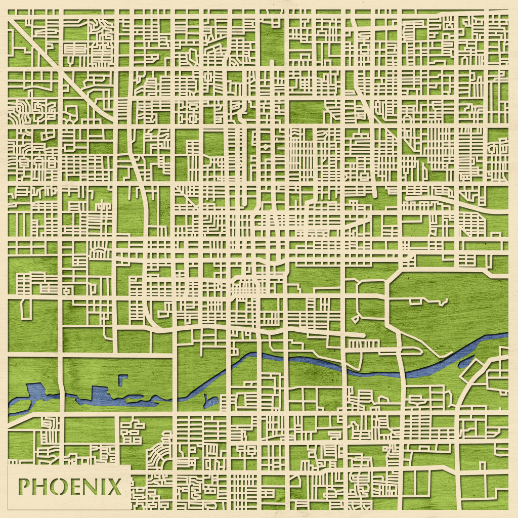 A rétegzett, lézervágott fa dekor Phoenix városszövetét, a belvárosi rácshálót és a sivatagi tengelyekhez igazodó főútvonalakat emeli ki tiszta, fókuszált kontúrokkal. A fa természetes textúrája nyugodt, barátságos jelenlétet ad, miközben a grafikus rajzolat rendezett, modern fókuszpontot hoz létre. Telepítése gyors és tiszta: fúrás nélkül, kétoldalas ragasztószalaggal javasolt rögzíteni sima, por- és zsírmentes, száraz falfelületre. A termék két méretben (48 × 48 cm; 70 × 70 cm) és három színben – Zöld (természetközeli), Fekete (letisztult kontraszt), Ében (elegáns mélység) – kapható. Ajándékként is univerzális, visszafogott és időtálló.