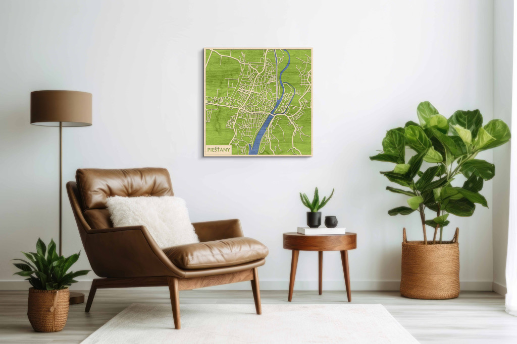 A rétegzett, lézervágott fa dekor Piešťany városszövetét, a fürdőszigetek körüli tengelyeket és a folyóágak hidainak csomópontjait emeli ki tiszta, fókuszált kontúrokkal. A fa természetes textúrája nyugodt, barátságos jelenlétet ad, miközben a grafikus rajzolat rendezett, modern fókuszpontot hoz létre. Telepítése gyors és tiszta: fúrás nélkül, kétoldalas ragasztószalaggal javasolt rögzíteni sima, por- és zsírmentes, száraz falfelületre. A termék két méretben (48 × 48 cm; 70 × 70 cm) és három színben – Zöld (természetközeli), Fekete (letisztult), Ében (elegáns) – kapható. Ajándéknak is univerzális, visszafogott és időtálló.