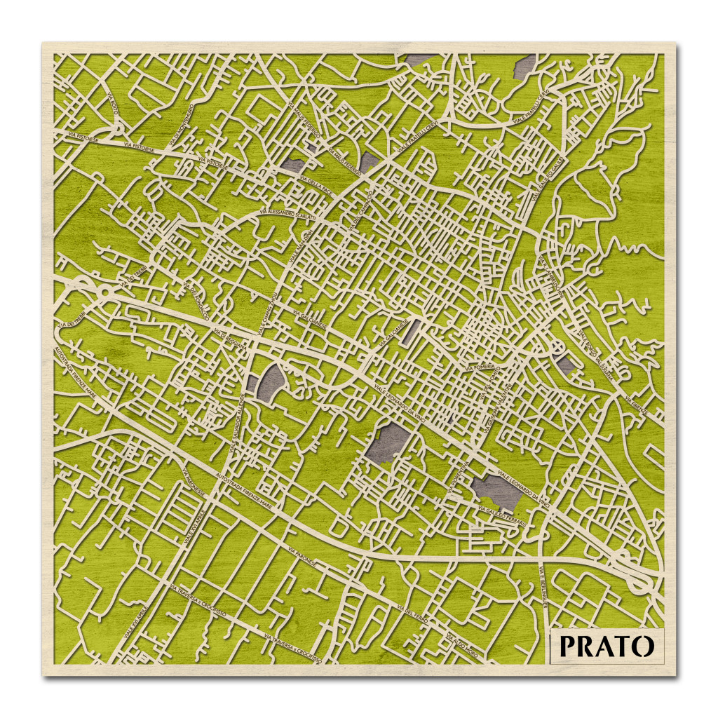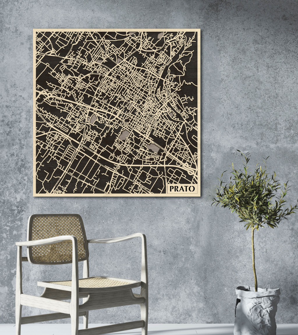 A rétegzett, lézervágott fa dekor Prato városszövetét, a főbb körutakat és ipari negyedekhez kapcsolódó csomópontokat emeli ki tiszta, fókuszált kontúrokkal. A fa természetes textúrája nyugodt, barátságos jelenlétet biztosít, miközben a grafikus rajzolat rendezett, modern fókuszpontot teremt. Telepítése kényelmes és tiszta: fúrás nélkül, kétoldalas ragasztószalaggal javasolt rögzíteni sima, por- és zsírmentes, száraz falfelületre. A termék két méretben (48 × 48 cm; 70 × 70 cm) és három színben – Zöld (természetközeli), Fekete (letisztult), Ében (elegáns) – kapható. Ajándékként is univerzális, visszafogott és időtálló.