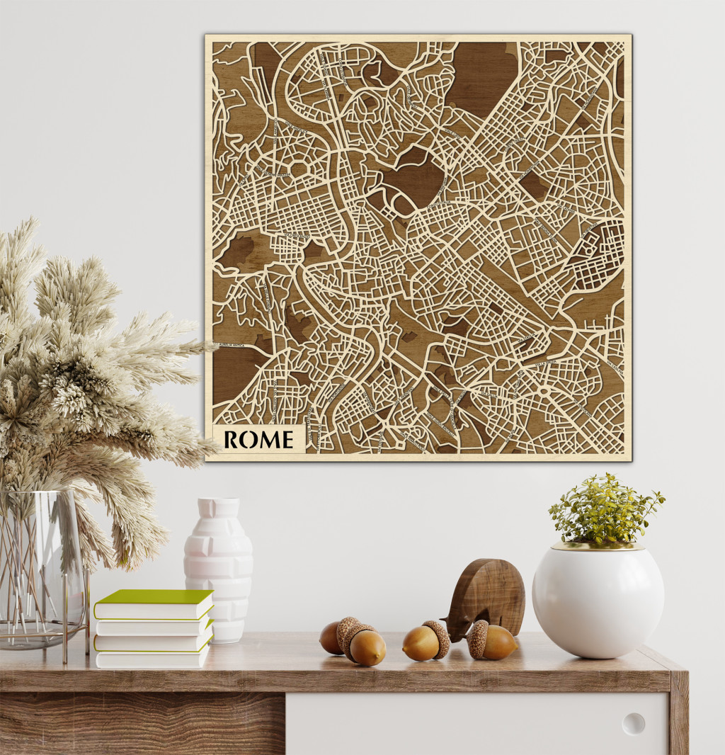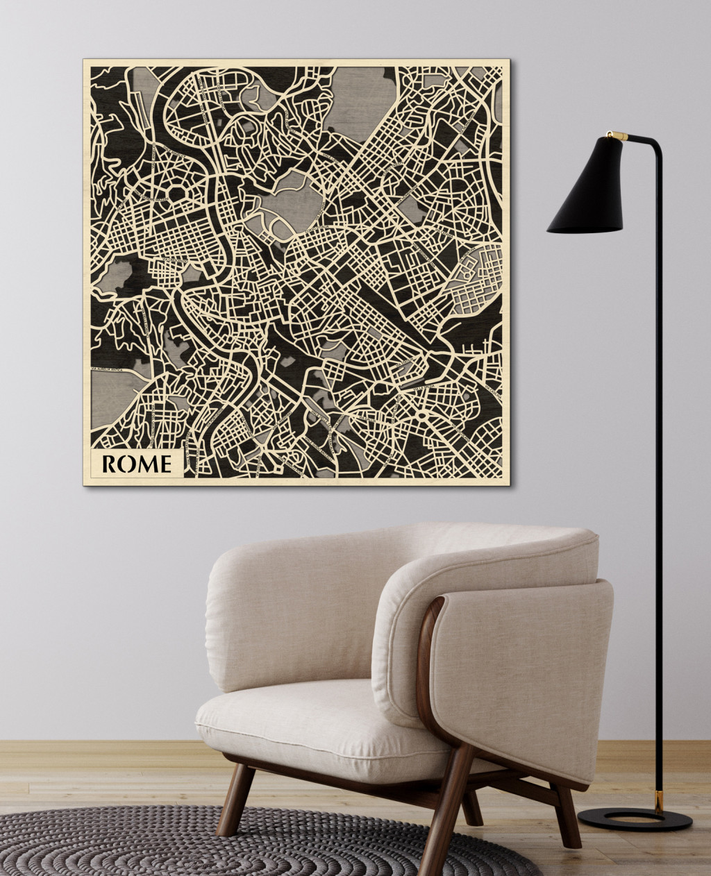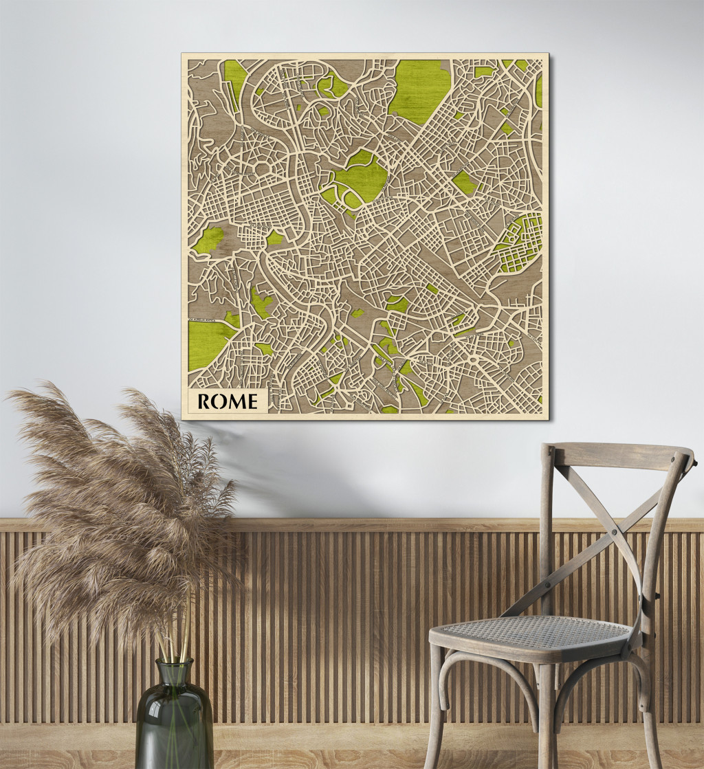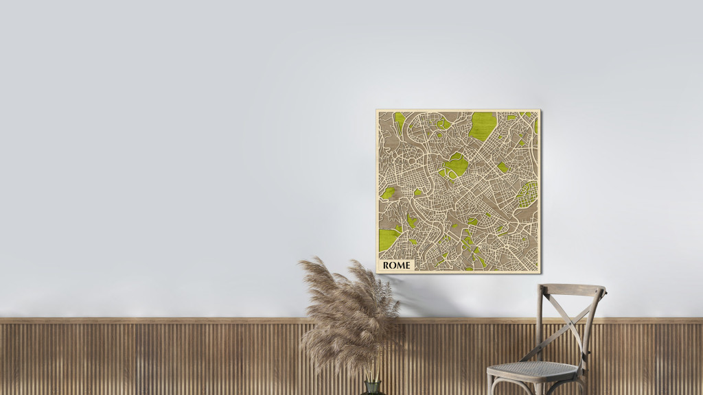 A rétegzett, lézervágott fa dekor Roma városszövetét, a történelmi központ utcáinak hálózatát és a Tevere-hidak csomópontjait emeli ki tiszta, fókuszált kontúrokkal. A fa természetes textúrája barátságos, kiegyensúlyozott jelenlétet ad, miközben a grafikus rajzolat rendezett, modern fókuszpontot hoz létre. Telepítése gyors és tiszta: fúrás nélkül, kétoldalas ragasztószalaggal javasolt felhelyezni sima, por- és zsírmentes, száraz falra. A termék két méretben (48 × 48 cm; 70 × 70 cm) és három színben – Zöld (természetközeli), Fekete (letisztult), Ében (elegáns) – kapható. Ajándéknak is univerzális, visszafogott és időtálló megjelenéssel.