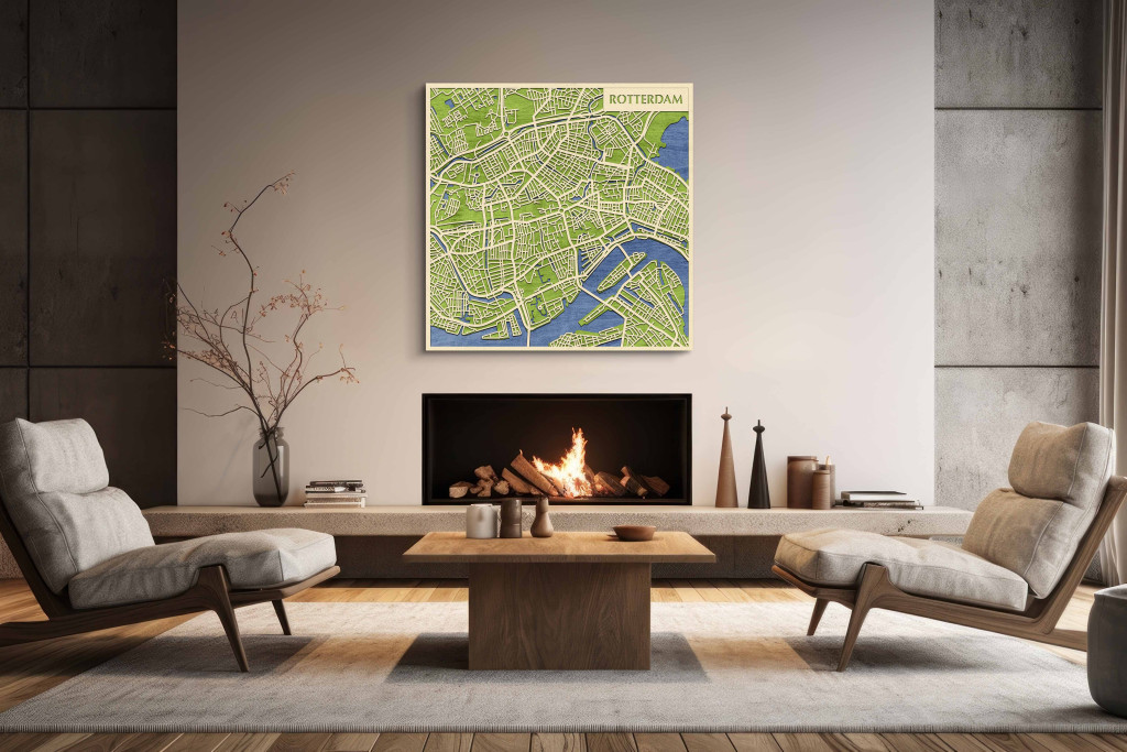 A rétegzett, lézervágott fa dekor Rotterdam városszövetét, a Maas folyó ágainak tengelyeit és a belvárosi modern csomópontokat emeli ki tiszta, fókuszált kontúrokkal. A fa természetes textúrája nyugodt, barátságos jelenlétet biztosít, miközben a grafikus rajzolat rendezett, modern fókuszpontot teremt. Telepítése kényelmes és tiszta: fúrás nélkül, kétoldalas ragasztószalaggal javasolt rögzíteni sima, por- és zsírmentes, száraz falfelületre. A termék két méretben (48 × 48 cm; 70 × 70 cm) és három színben – Zöld (természetközeli), Fekete (letisztult kontraszt), Ében (elegáns mélység) – kapható. Ajándékként is univerzális, visszafogott és időtálló.