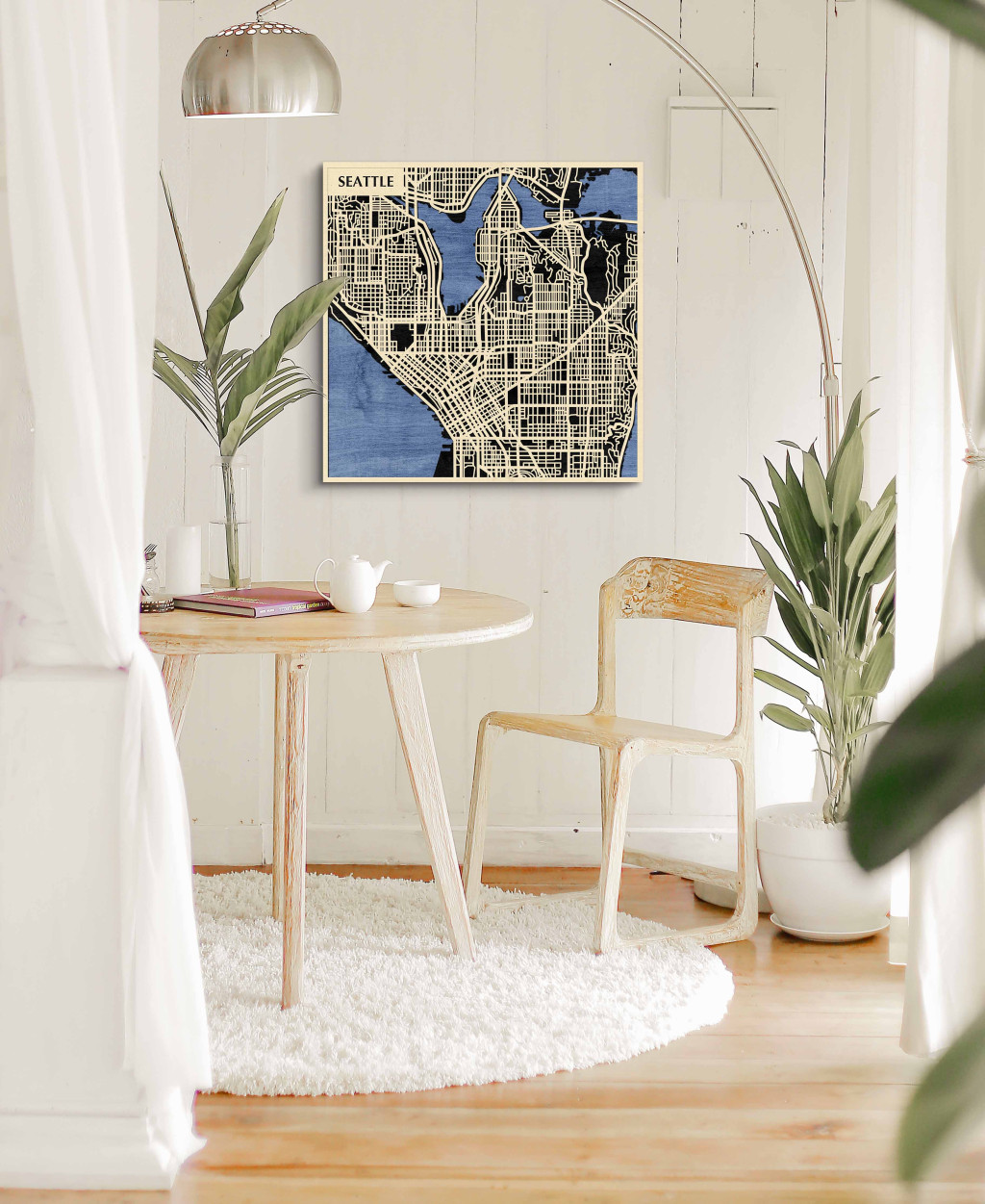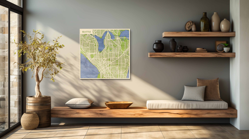 A rétegzett, lézervágott fa dekor Seattle városszövetét, az Elliott-öböl és a Lake Union közötti tengelyeket, valamint a belvárosi csomópontokat emeli ki tiszta, fókuszált kontúrokkal. A fa természetes textúrája barátságos, kiegyensúlyozott jelenlétet ad, miközben a grafikus rajzolat rendezett, modern fókuszpontot hoz létre. Telepítése gyors és tiszta: fúrás nélkül, kétoldalas ragasztószalaggal javasolt felhelyezni sima, por- és zsírmentes, száraz falra. A termék két méretben (48 × 48 cm; 70 × 70 cm) és három színben – Zöld (természetközeli), Fekete (letisztult), Ében (elegáns) – kapható. Ajándéknak is univerzális, visszafogott és időtálló megjelenéssel.