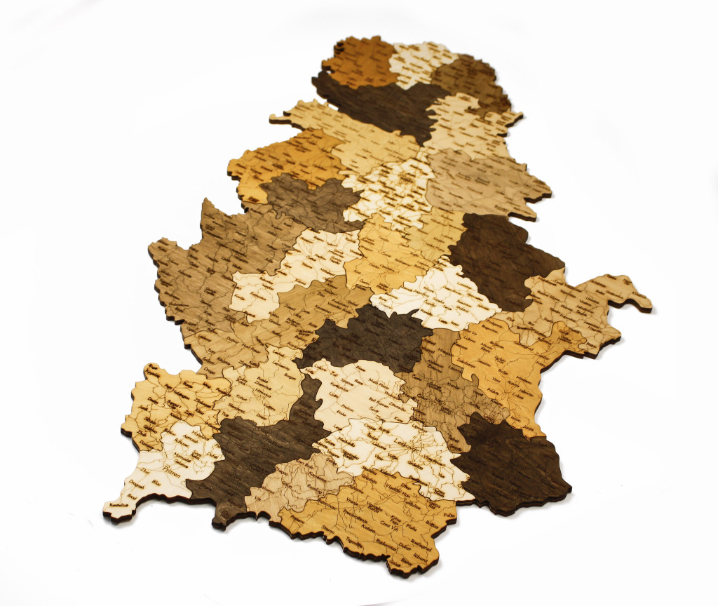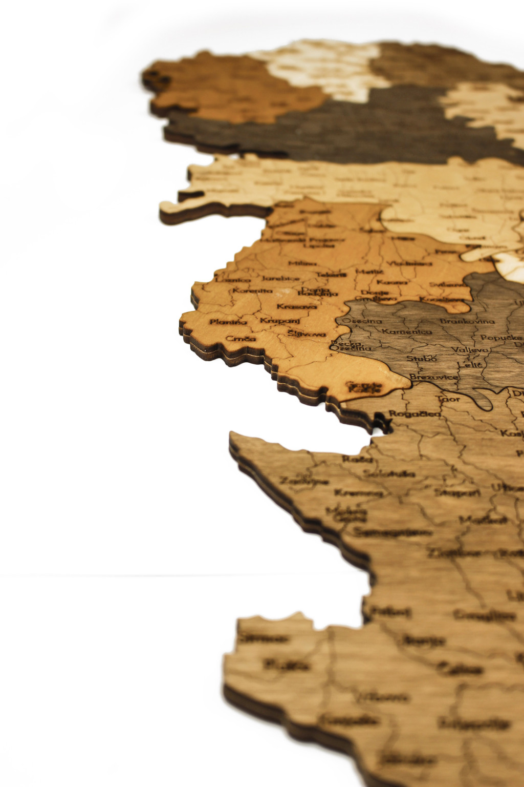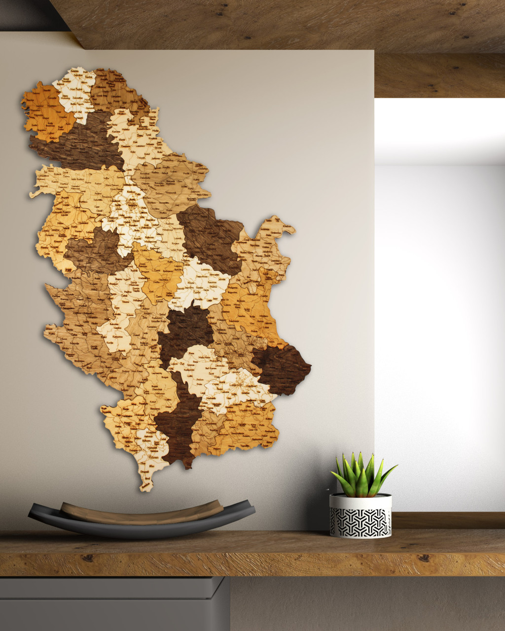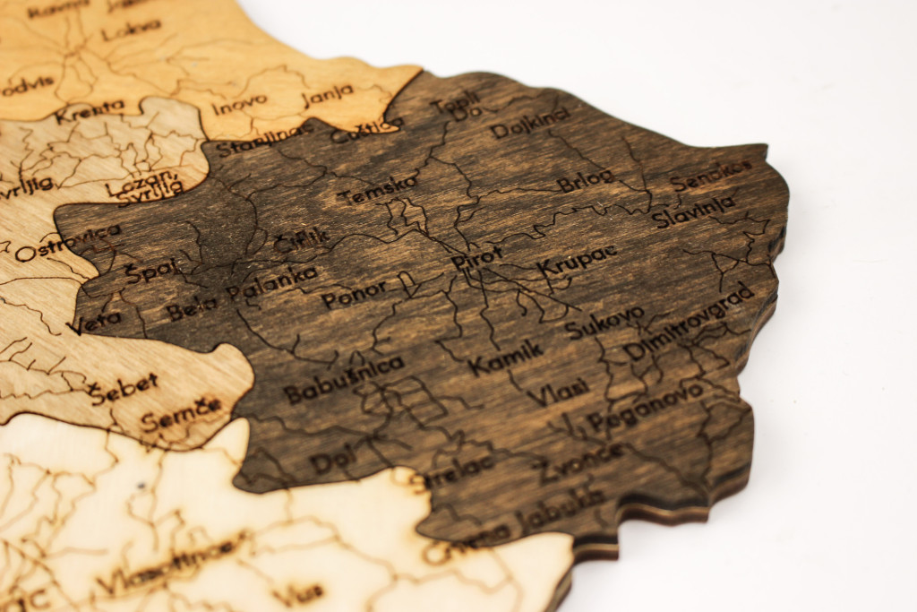 Forma & Kontextus: Kiegyensúlyozott, belső-európai pozícióra épülő térképi arány. Közép-Balkán vizuális csomópontként használható szomszédos országokkal együtt (pl. tematikus régiós fal).