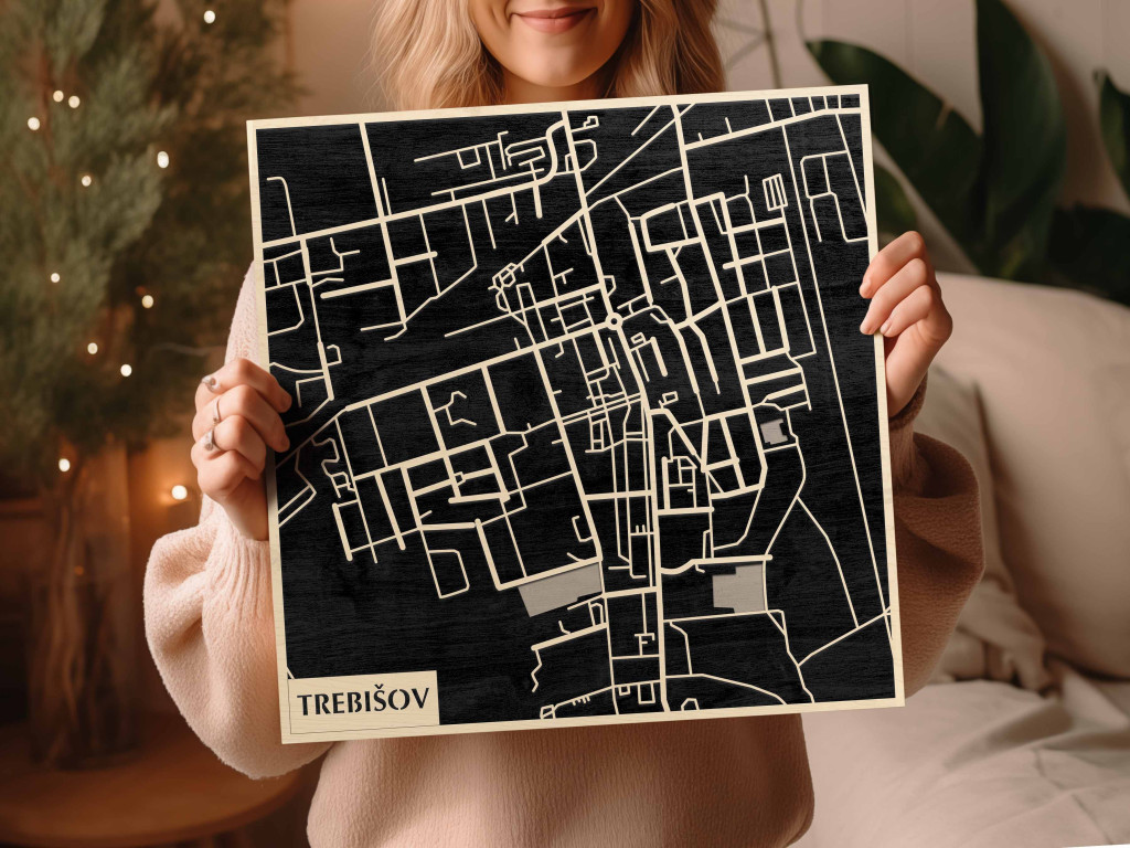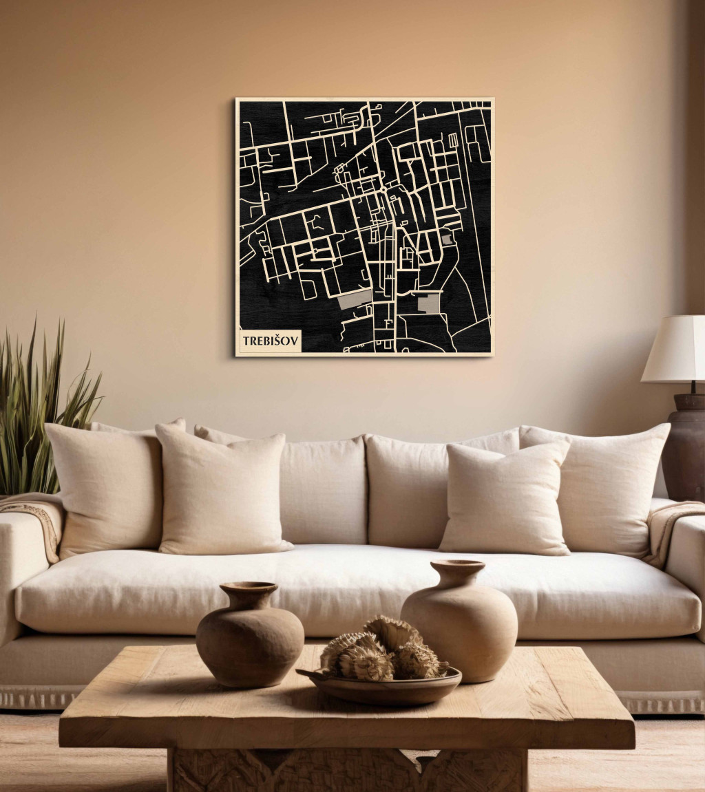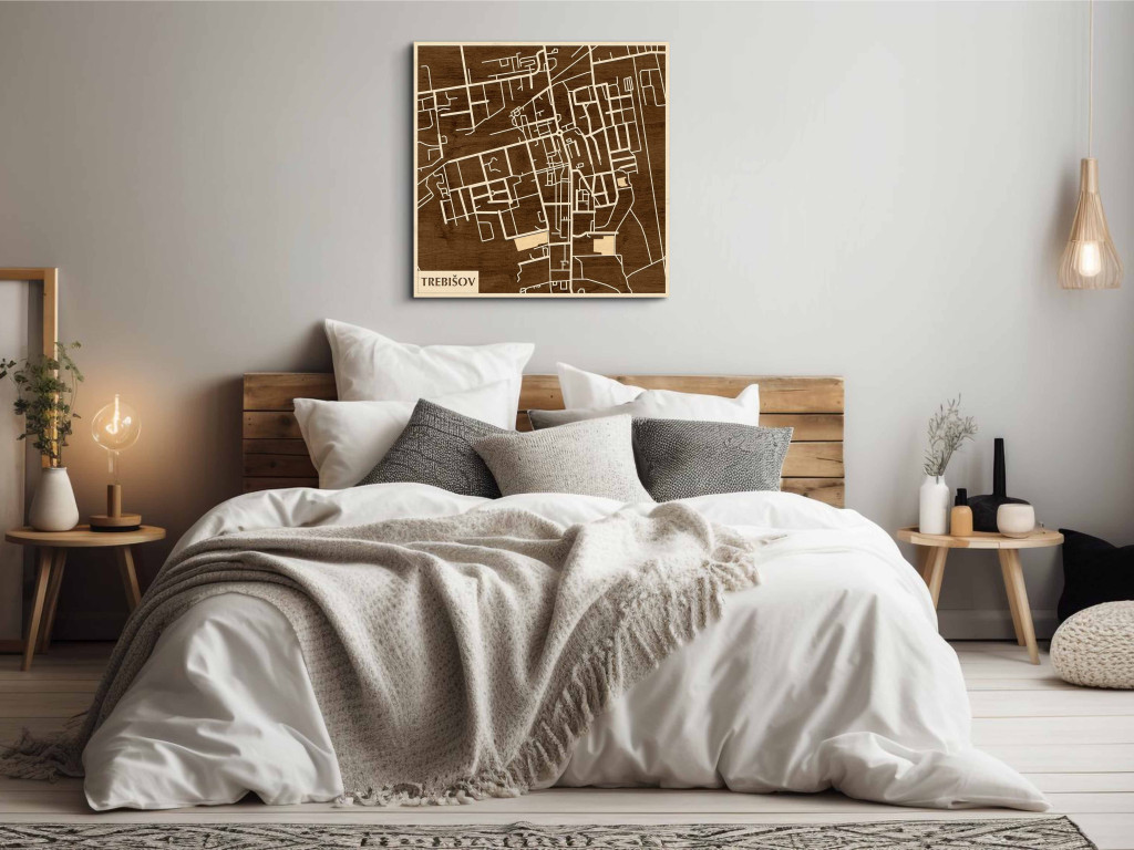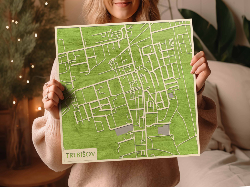 A rétegzett, lézervágott fa dekor Trebišov városszövetét, a főbb csomópontokat és a központot övező tengelyeket emeli ki tiszta, fókuszált kontúrokkal. A fa természetes textúrája nyugodt, barátságos jelenlétet biztosít, miközben a grafikus rajzolat rendezett, modern fókuszpontot teremt. Telepítése kényelmes és tiszta: fúrás nélkül, kétoldalas ragasztószalaggal javasolt rögzíteni sima, por- és zsírmentes, száraz falfelületre. A termék két méretben (48 × 48 cm; 70 × 70 cm) és három színben – Zöld (természetközeli), Fekete (letisztult kontraszt), Ében (elegáns mélység) – kapható. Ajándékként is univerzális, visszafogott és időtálló.
