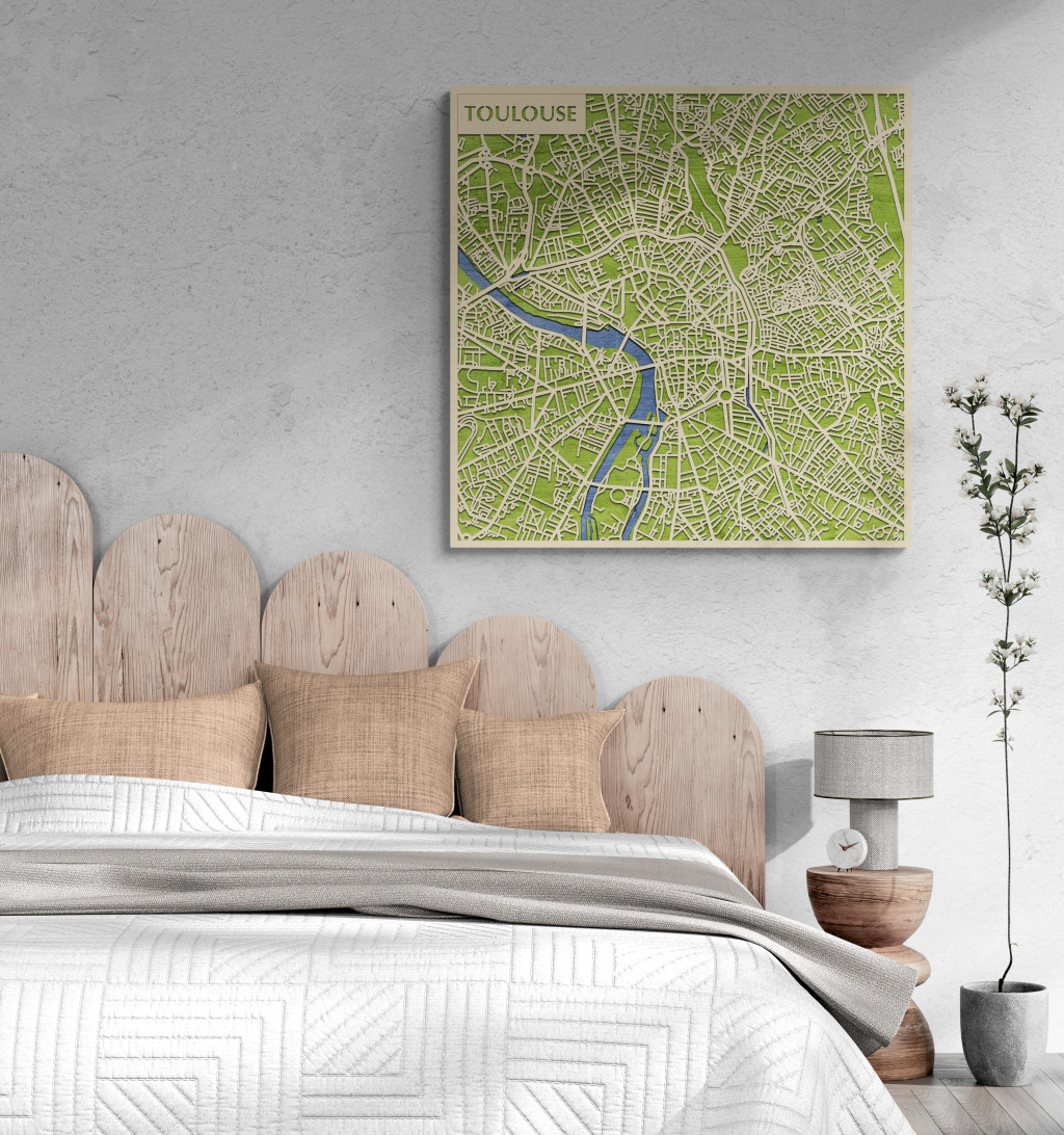 A rétegzett, lézervágott fa dekor Toulouse városszövetét, a Garonne és a csatornák által kijelölt tengelyeket, valamint a történelmi hidak csomópontjait emeli ki tiszta, fókuszált kontúrokkal. A fa természetes textúrája nyugodt, barátságos jelenlétet biztosít, miközben a grafikus rajzolat rendezett, modern fókuszpontot teremt. Telepítése kényelmes és tiszta: fúrás nélkül, kétoldalas ragasztószalaggal javasolt rögzíteni sima, por- és zsírmentes, száraz falfelületre. A termék két méretben (48 × 48 cm; 70 × 70 cm) és három színben – Zöld (természetközeli), Fekete (letisztult kontraszt), Ében (elegáns mélység) – kapható. Ajándékként is univerzális, visszafogott és időtálló.