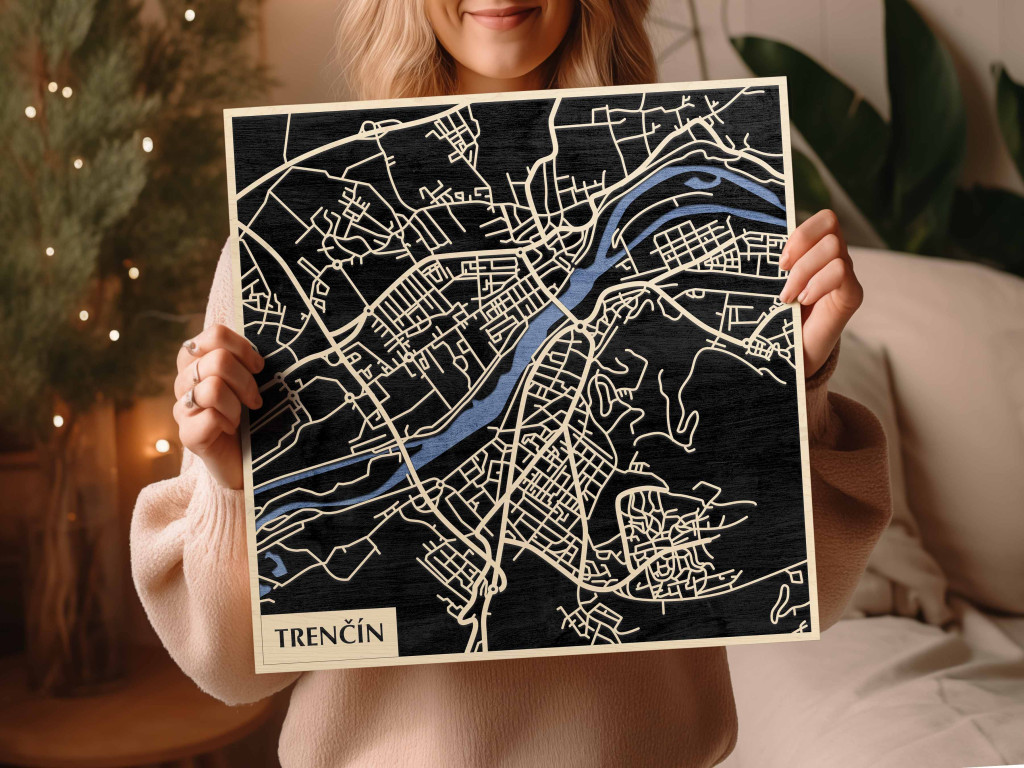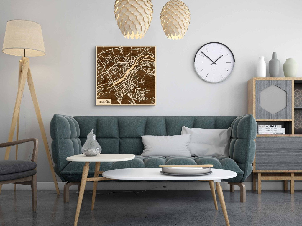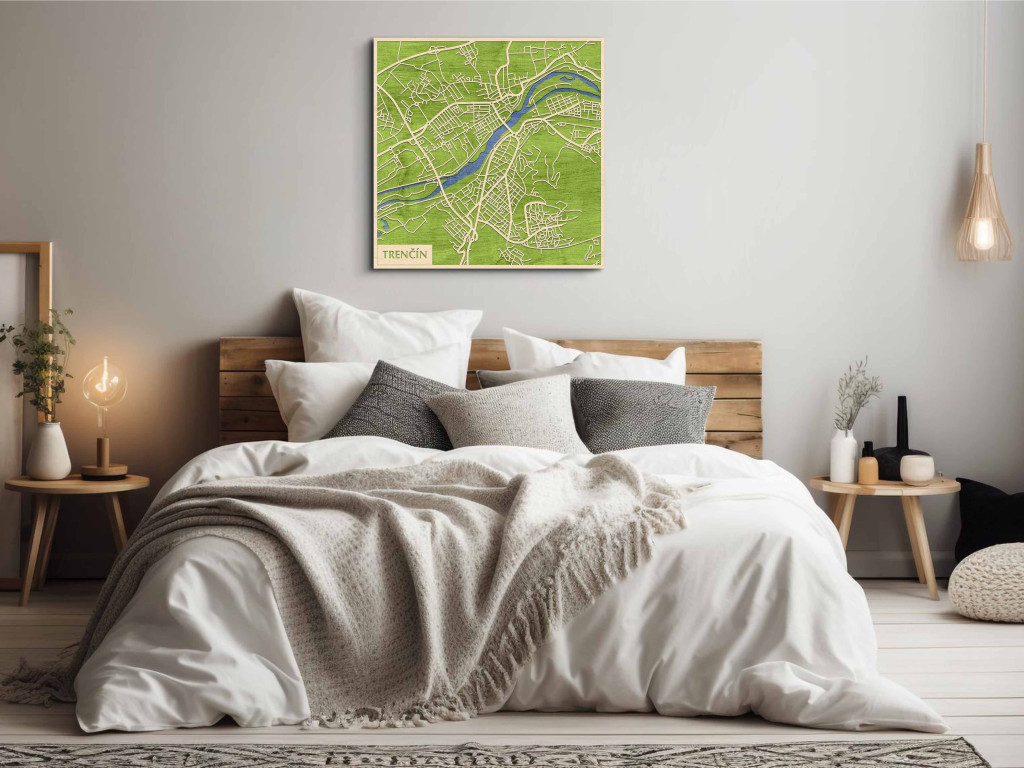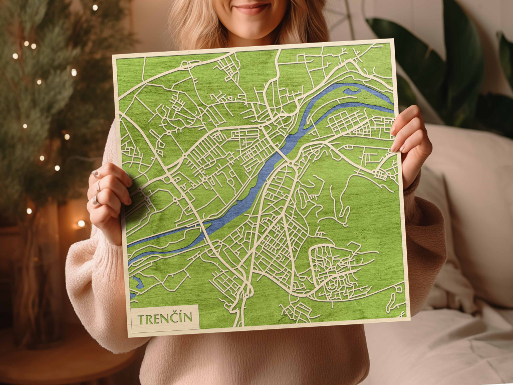 A rétegzett, lézervágott fa dekor Trenčín városszövetét, a várhegy alatti csomópontokat és a Vág folyóhoz igazodó fő tengelyeket emeli ki tiszta, fókuszált kontúrokkal. A fa természetes textúrája barátságos, kiegyensúlyozott jelenlétet ad, miközben a grafikus rajzolat rendezett, modern fókuszpontot hoz létre. Telepítése gyors és tiszta: fúrás nélkül, kétoldalas ragasztószalaggal javasolt felhelyezni sima, por- és zsírmentes, száraz falra. A termék két méretben (48 × 48 cm; 70 × 70 cm) és három színben – Zöld (természetközeli), Fekete (letisztult), Ében (elegáns) – kapható. Ajándéknak is univerzális, visszafogott és időtálló megjelenéssel.