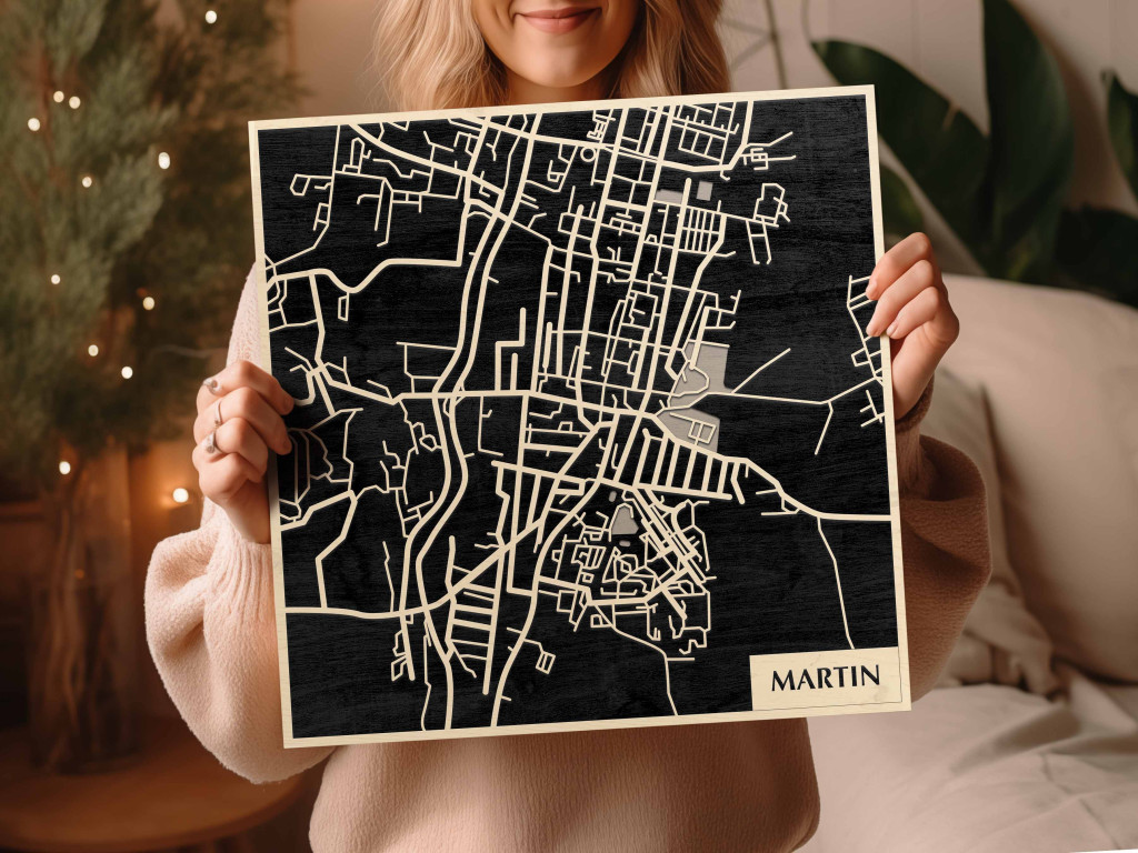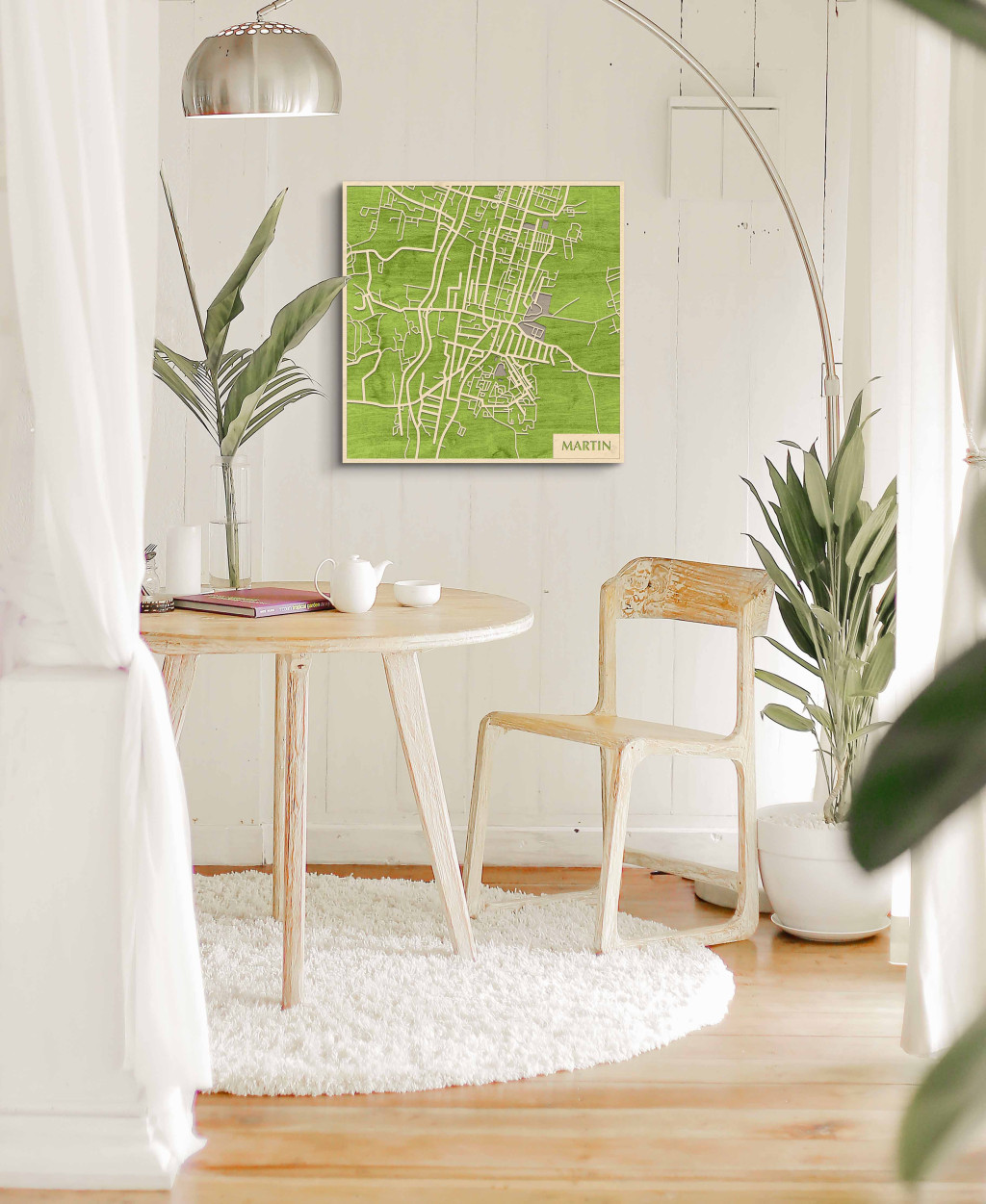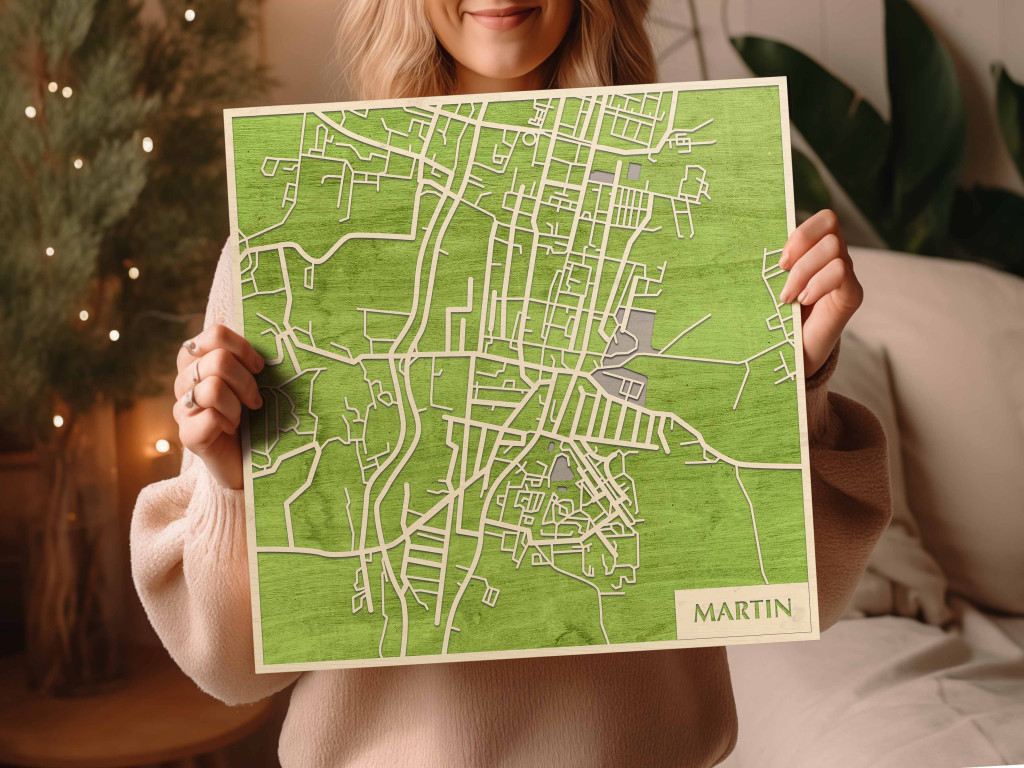 A rétegzett, lézervágott fa dekor Martin városszövetét, a Turóc-völgy tengelyét és a központi csomópontokat emeli ki tiszta, fókuszált kontúrokkal. A fa természetes textúrája nyugodt, barátságos jelenlétet biztosít, miközben a grafikus rajzolat rendezett, modern fókuszpontot teremt. Telepítése kényelmes és tiszta: fúrás nélkül, kétoldalas ragasztószalaggal javasolt rögzíteni sima, por- és zsírmentes, száraz falfelületre. A termék két méretben (48 × 48 cm; 70 × 70 cm) és három színben – Zöld (természetközeli), Fekete (letisztult kontraszt), Ében (elegáns mélység) – kapható. Ajándékként is univerzális, visszafogott és időtálló.
