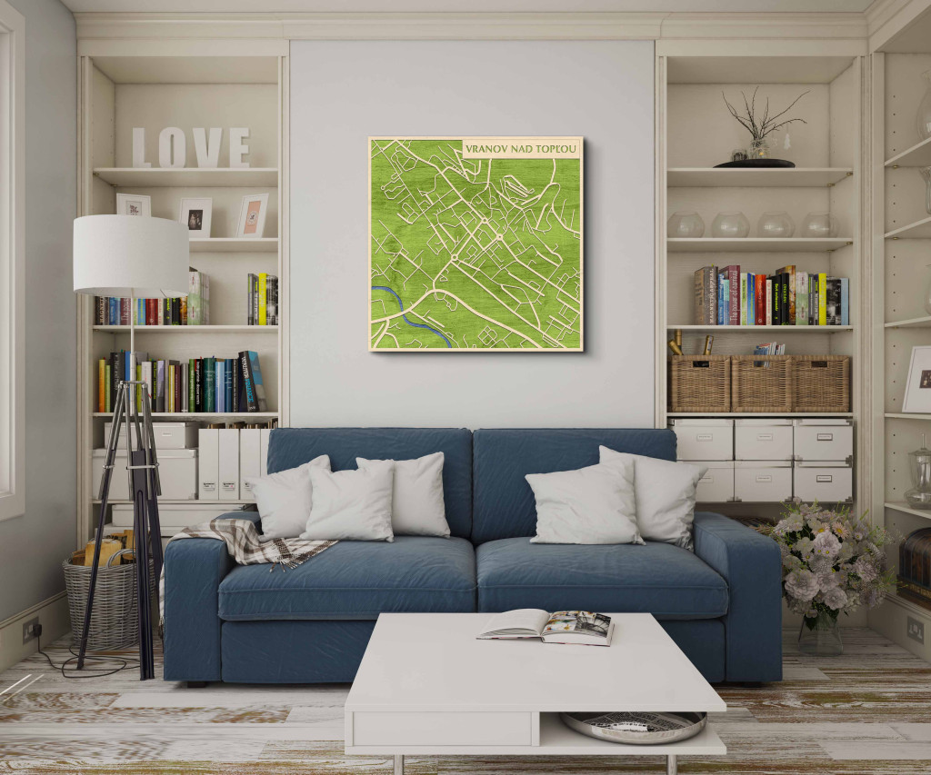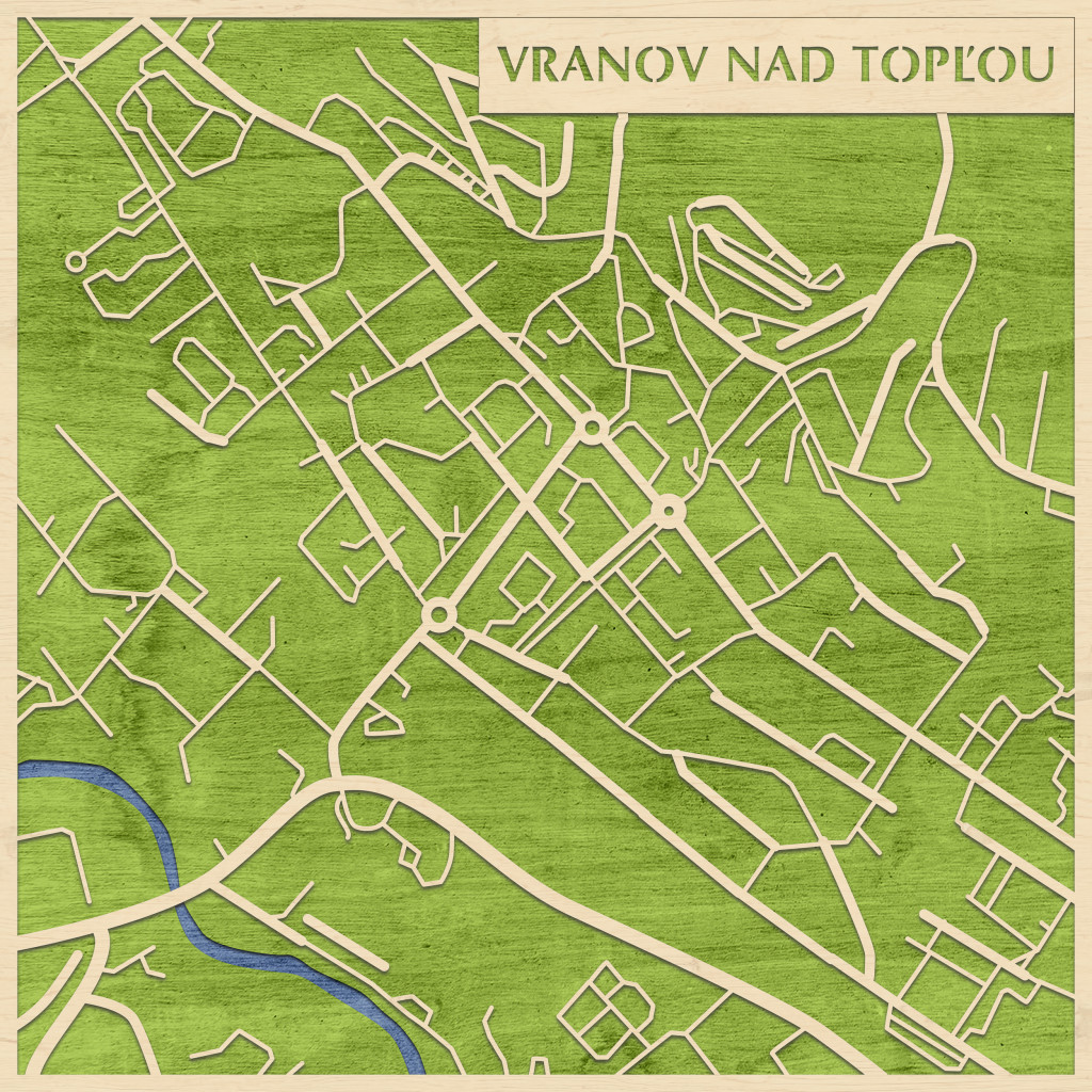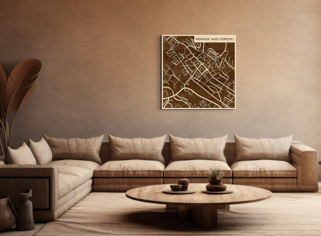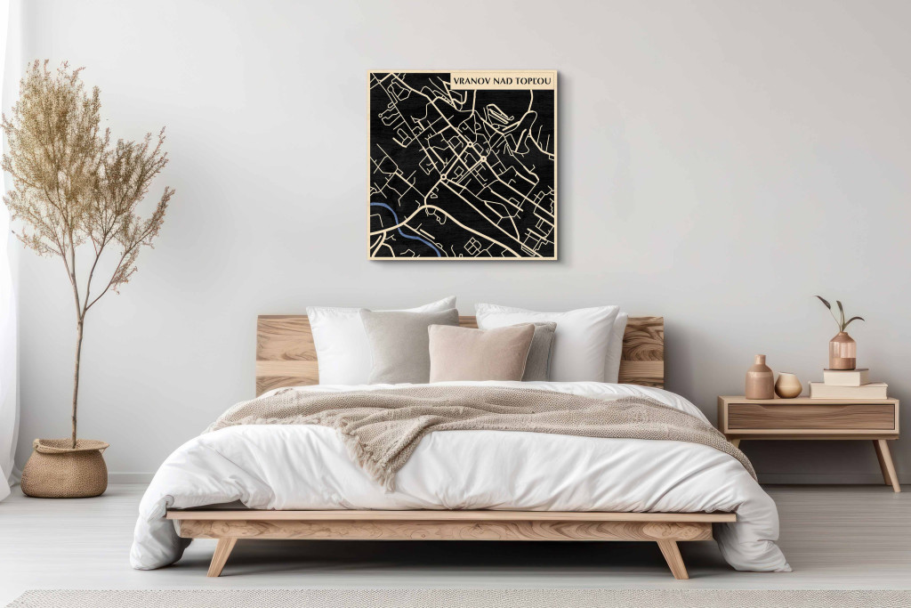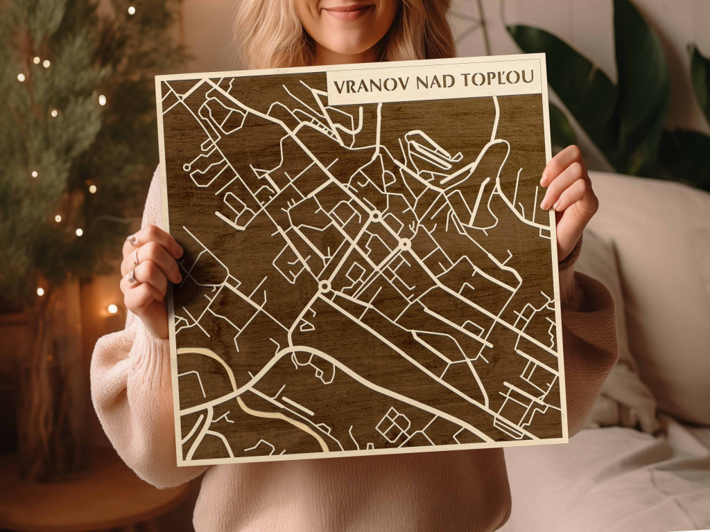 A rétegzett, lézervágott fa dekor Vranov nad Topľou városszövetét, a Topľa-völgy tengelyét és a központi csomópontokat emeli ki tiszta, fókuszált kontúrokkal. A fa természetes textúrája barátságos, kiegyensúlyozott jelenlétet ad, miközben a grafikus rajzolat rendezett, modern fókuszpontot hoz létre. Telepítése gyors és tiszta: fúrás nélkül, kétoldalas ragasztószalaggal javasolt felhelyezni sima, por- és zsírmentes, száraz falra. A termék két méretben (48 × 48 cm; 70 × 70 cm) és három színben – Zöld (természetközeli), Fekete (letisztult), Ében (elegáns) – kapható. Ajándéknak is univerzális, visszafogott és időtálló megjelenéssel.