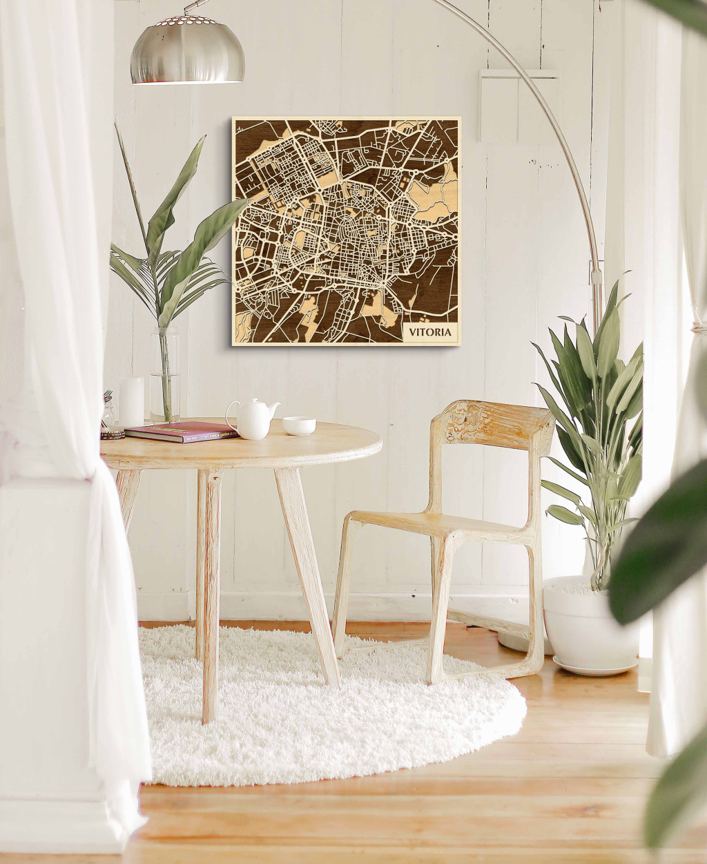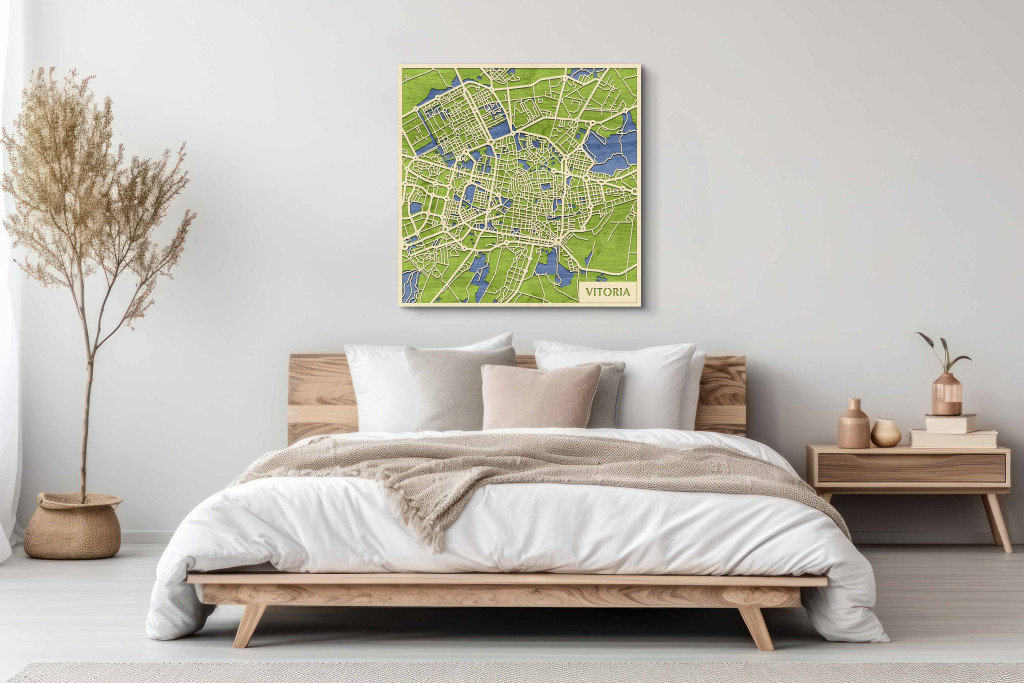A rétegzett, lézervágott fa dekor Vitoria-Gasteiz városszövetét, a körgyűrűk és radiális tengelyek rendszerét, valamint a történelmi mag csomópontjait emeli ki tiszta, fókuszált kontúrokkal. A fa természetes textúrája barátságos, kiegyensúlyozott jelenlétet ad, miközben a grafikus rajzolat rendezett, modern fókuszpontot hoz létre. Telepítése gyors és tiszta: fúrás nélkül, kétoldalas ragasztószalaggal javasolt felhelyezni sima, por- és zsírmentes, száraz falra. A termék két méretben (48 × 48 cm; 70 × 70 cm) és három színben – Zöld (természetközeli), Fekete (letisztult), Ében (elegáns) – kapható. Ajándéknak is univerzális, visszafogott és időtálló megjelenéssel.