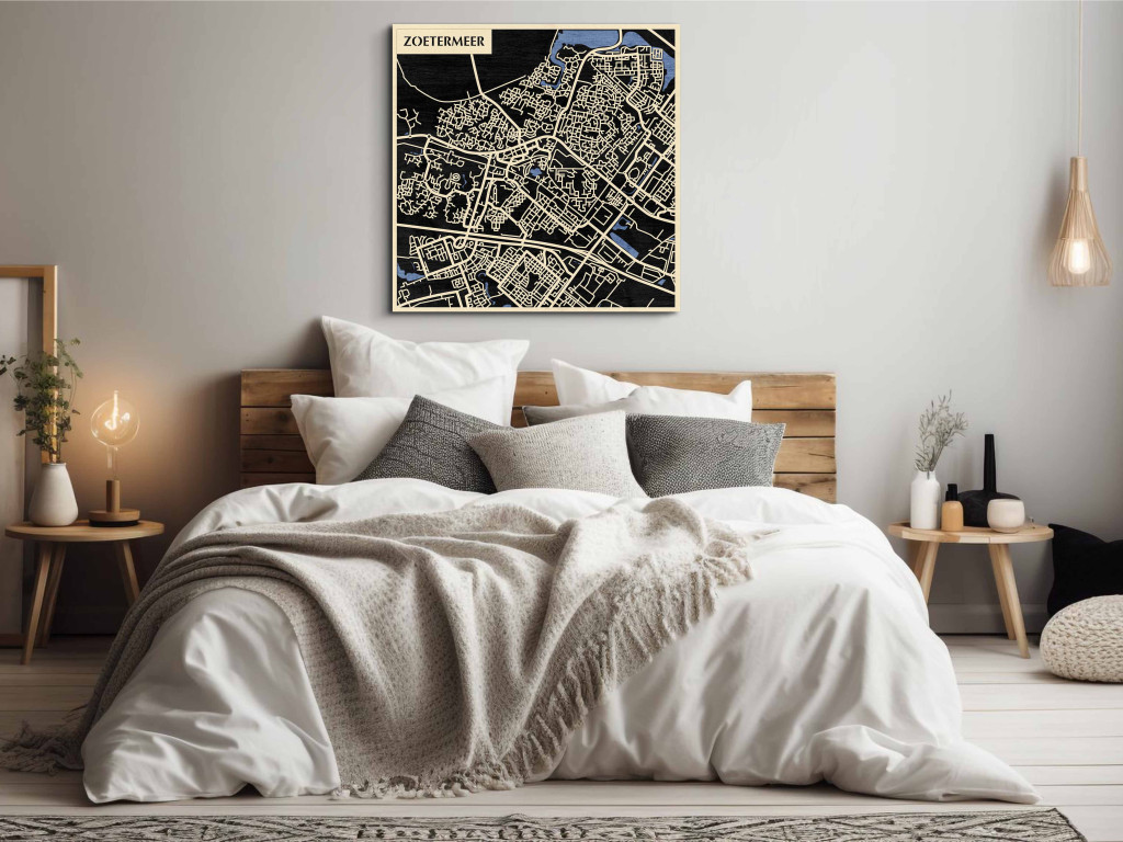 A rétegzett, lézervágott fa dekor Zoetermeer városszövetét, a centrumköröket és a lakónegyedeket összekötő főbb tengelyeket emeli ki tiszta, fókuszált kontúrokkal. A fa természetes textúrája nyugodt, barátságos jelenlétet biztosít, miközben a grafikus rajzolat rendezett, modern fókuszpontot teremt. Telepítése kényelmes és tiszta: fúrás nélkül, kétoldalas ragasztószalaggal javasolt rögzíteni sima, por- és zsírmentes, száraz falfelületre. A termék két méretben (48 × 48 cm; 70 × 70 cm) és három színben – Zöld (természetközeli), Fekete (letisztult kontraszt), Ében (elegáns mélység) – kapható. Ajándékként is univerzális, visszafogott és időtálló.